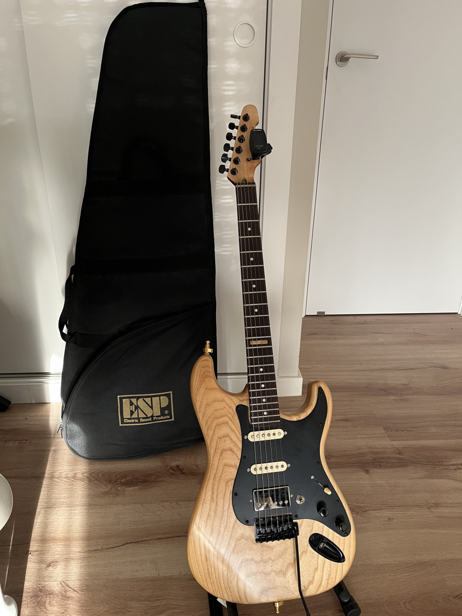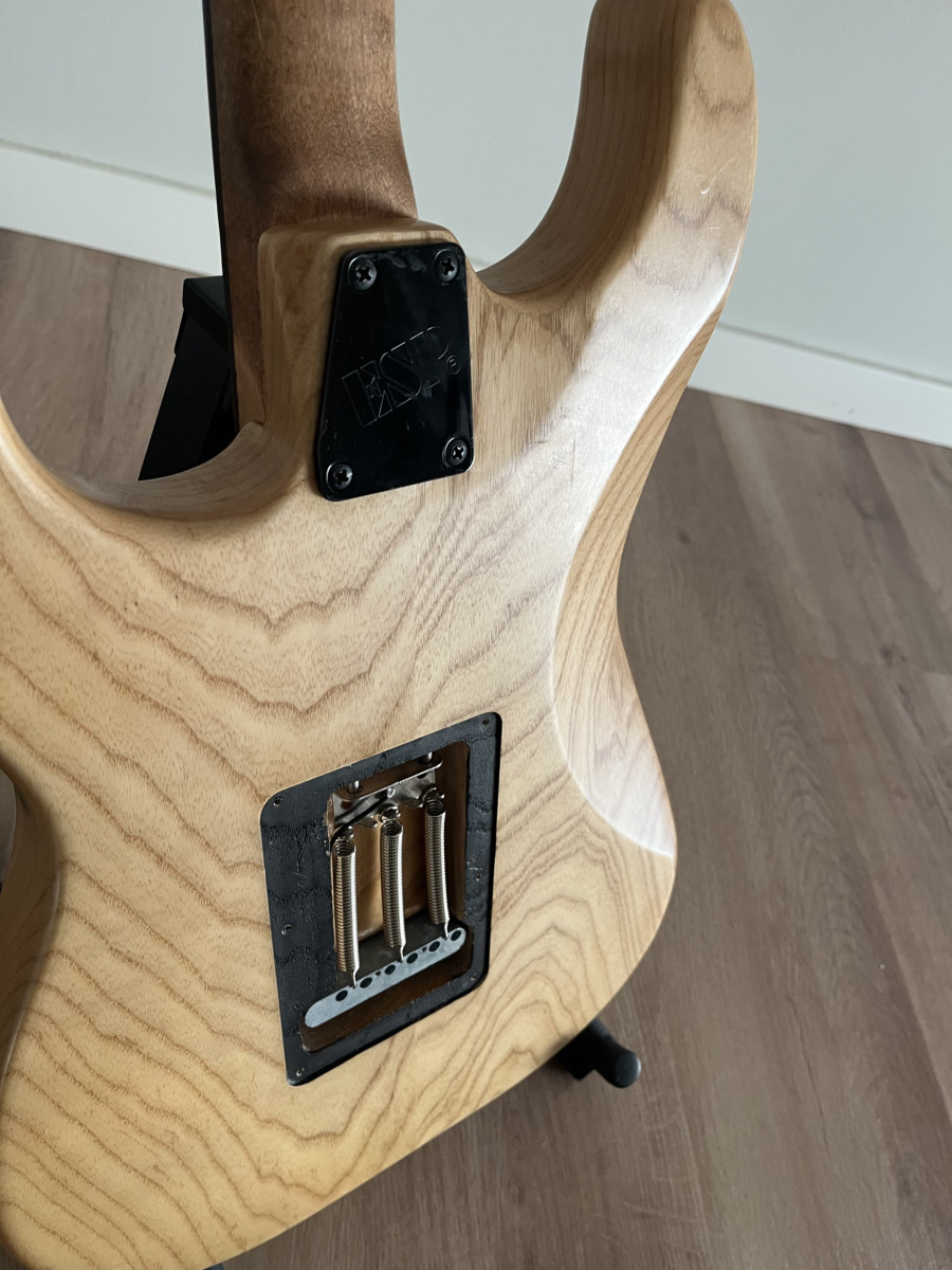 La compré ya con varias modificaciones: humbucker en el puente HSS (con push/pull para hacerla single), clavijero de bloqueo, puente tremolo con bloque gordo, el mástil tiene un tacto comodísimo, parece acabado a la cera como las music man (le pusieron decal de su hermana mayor) y enganches de bloqueo. Lleva su funda ESP.