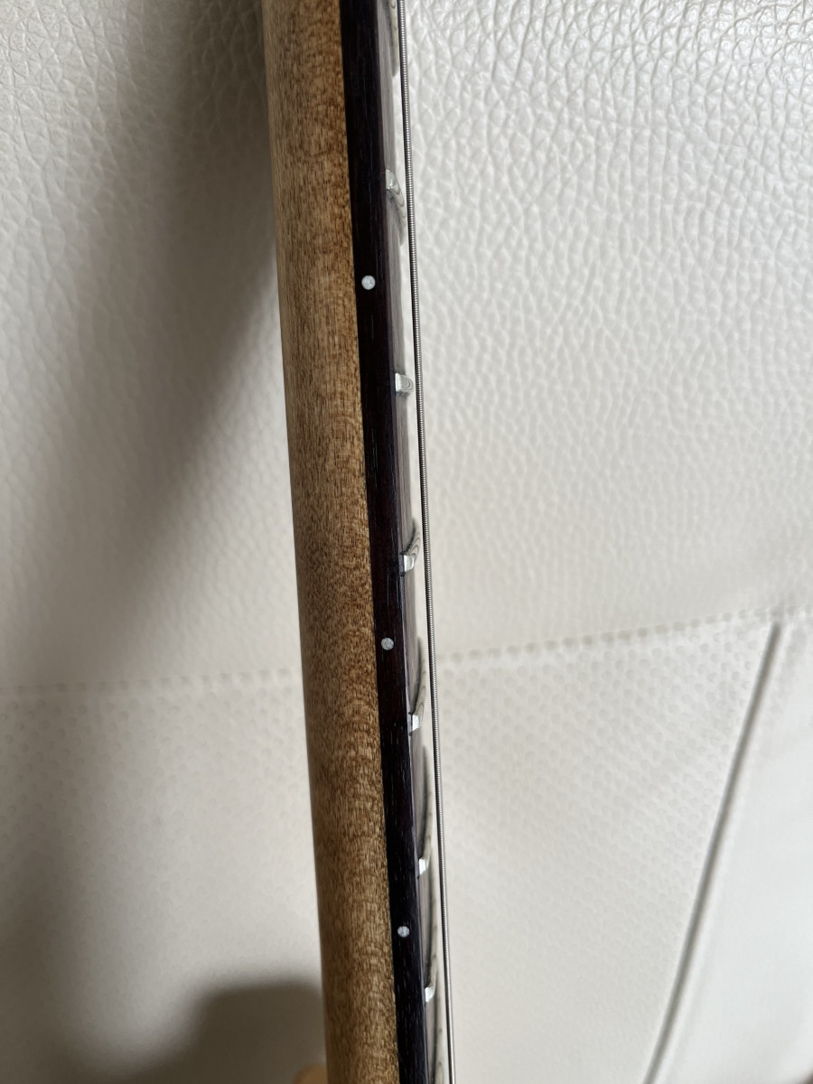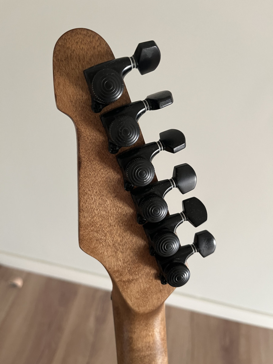 Guitarra de maderas fantásticas, tipo stratocaster pero más moderna, con Humbucker en puente, radio mas plano (creo que 12), buenos trastes y acceso muy cómodo para los solos