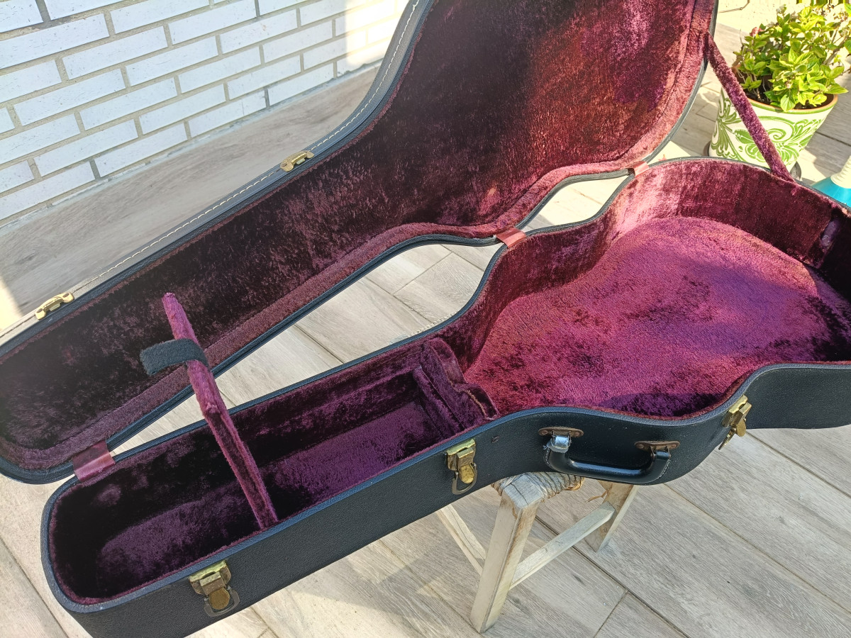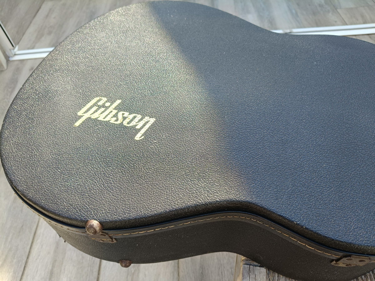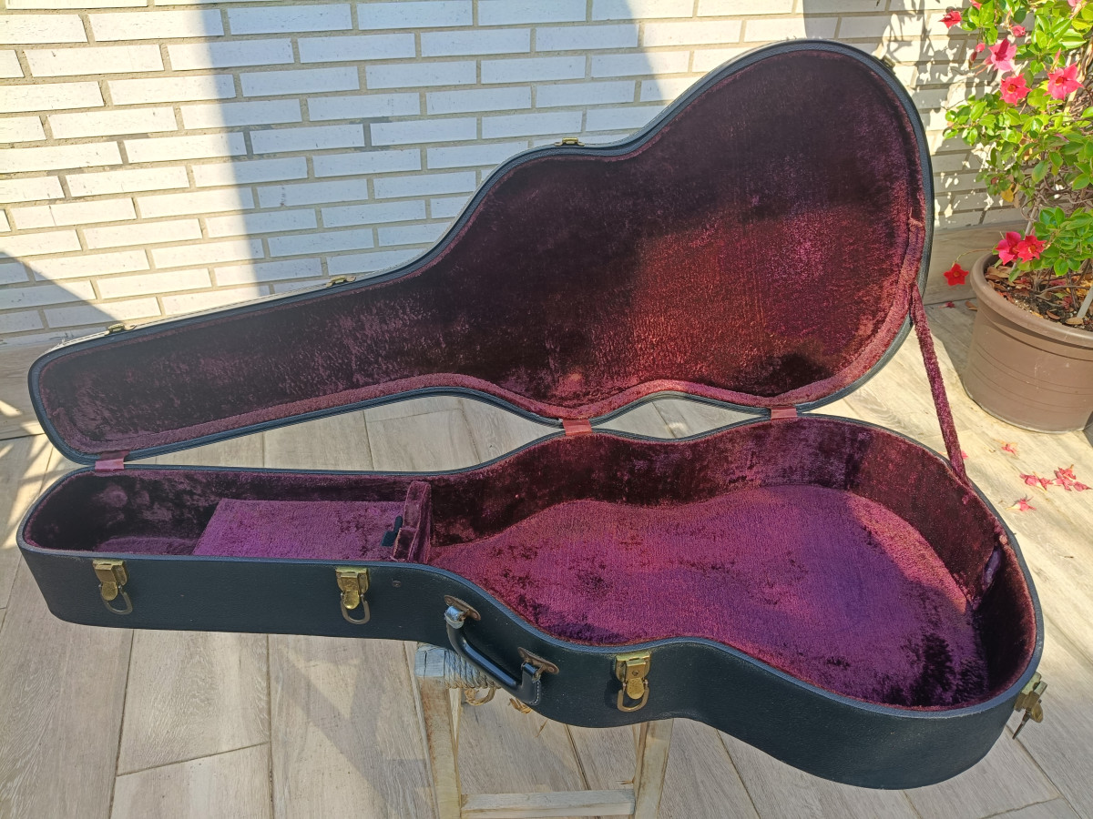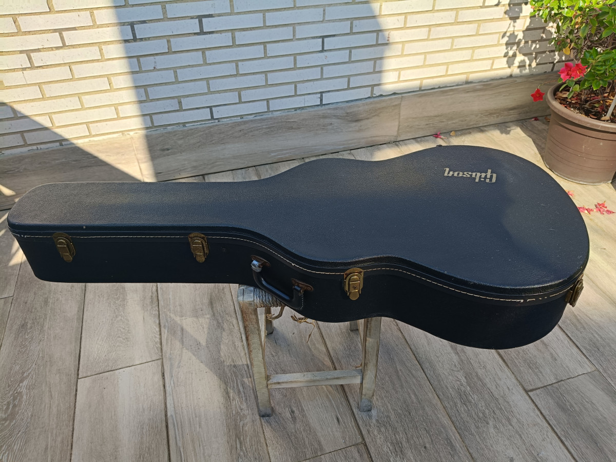 Estuche Gibson setentero. Tiene el trote lógico de su edad, partes del forro han sido repegadas y tiene algo de olor a cerrado.