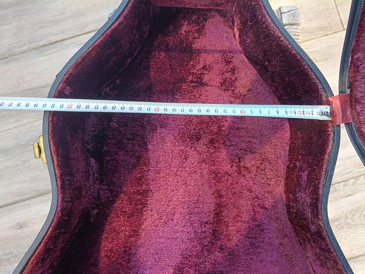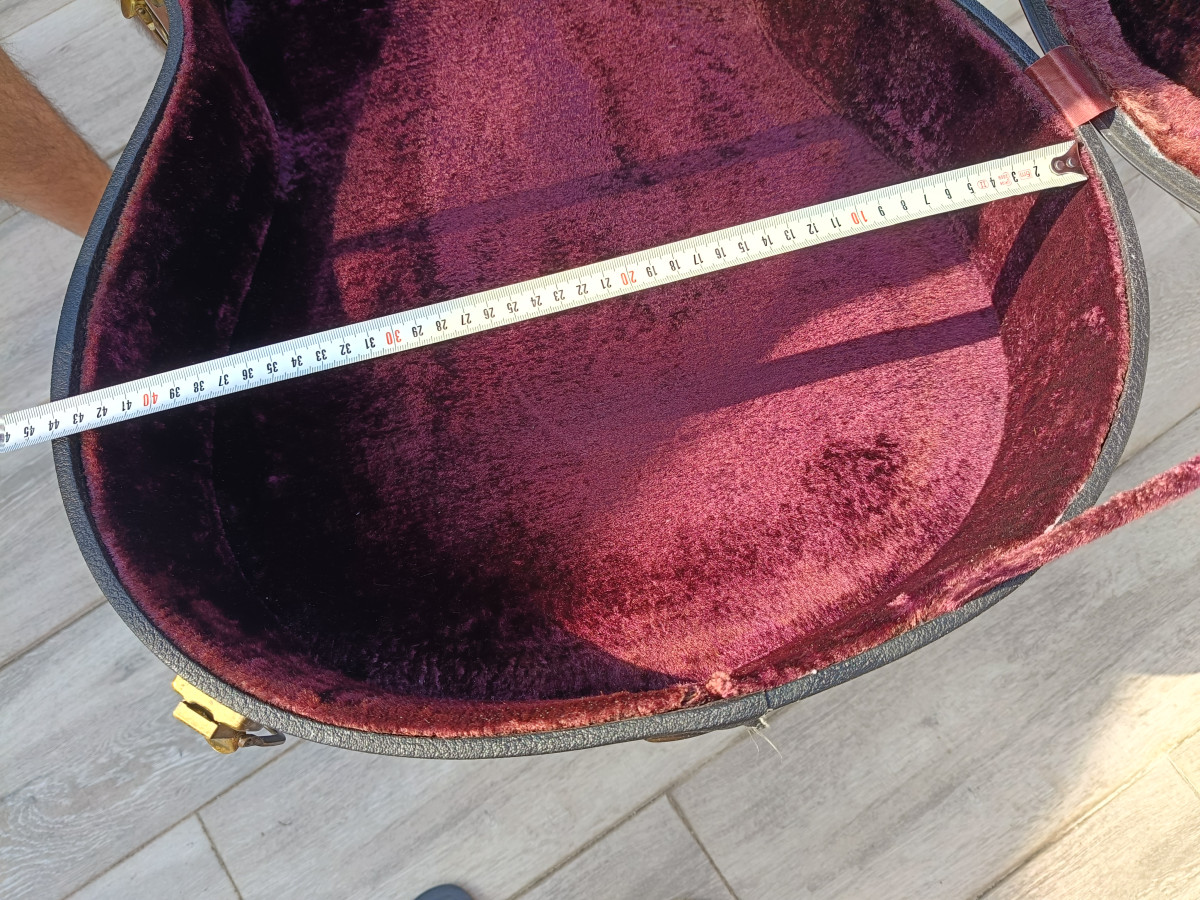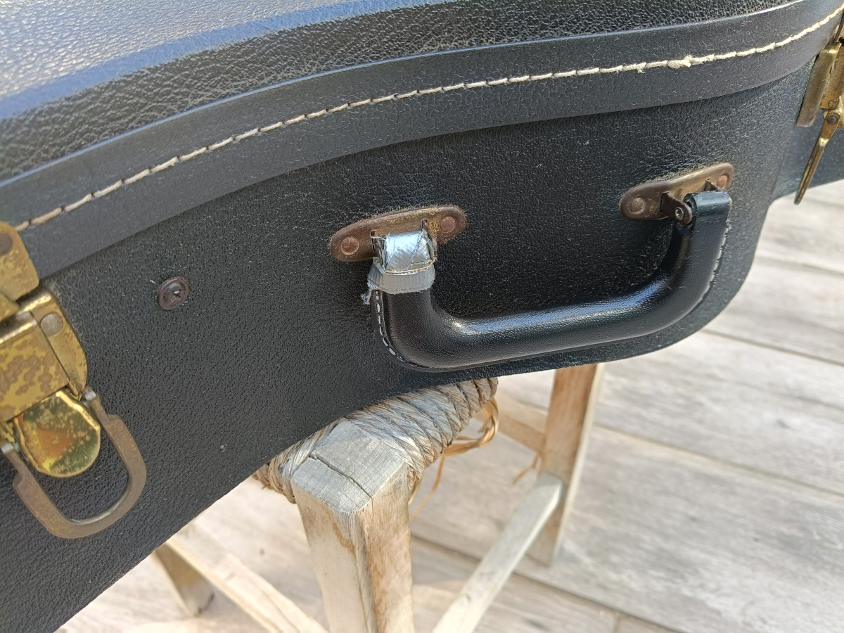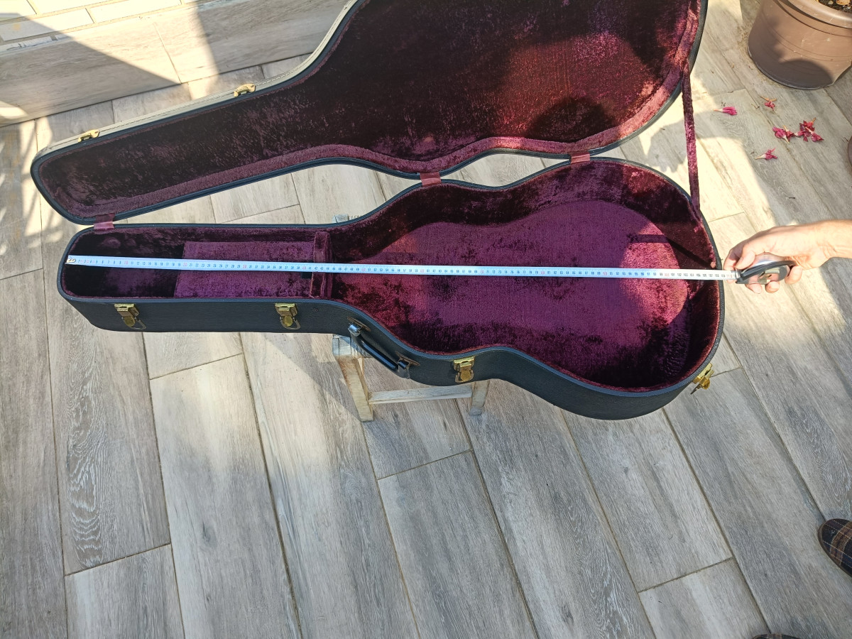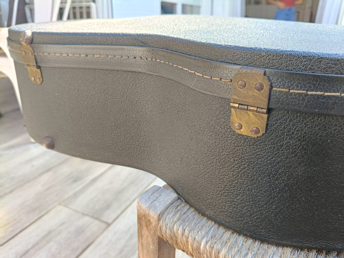 Estuche Gibson setentero. Tiene el trote lógico de su edad, partes del forro han sido repegadas y tiene algo de olor a cerrado.