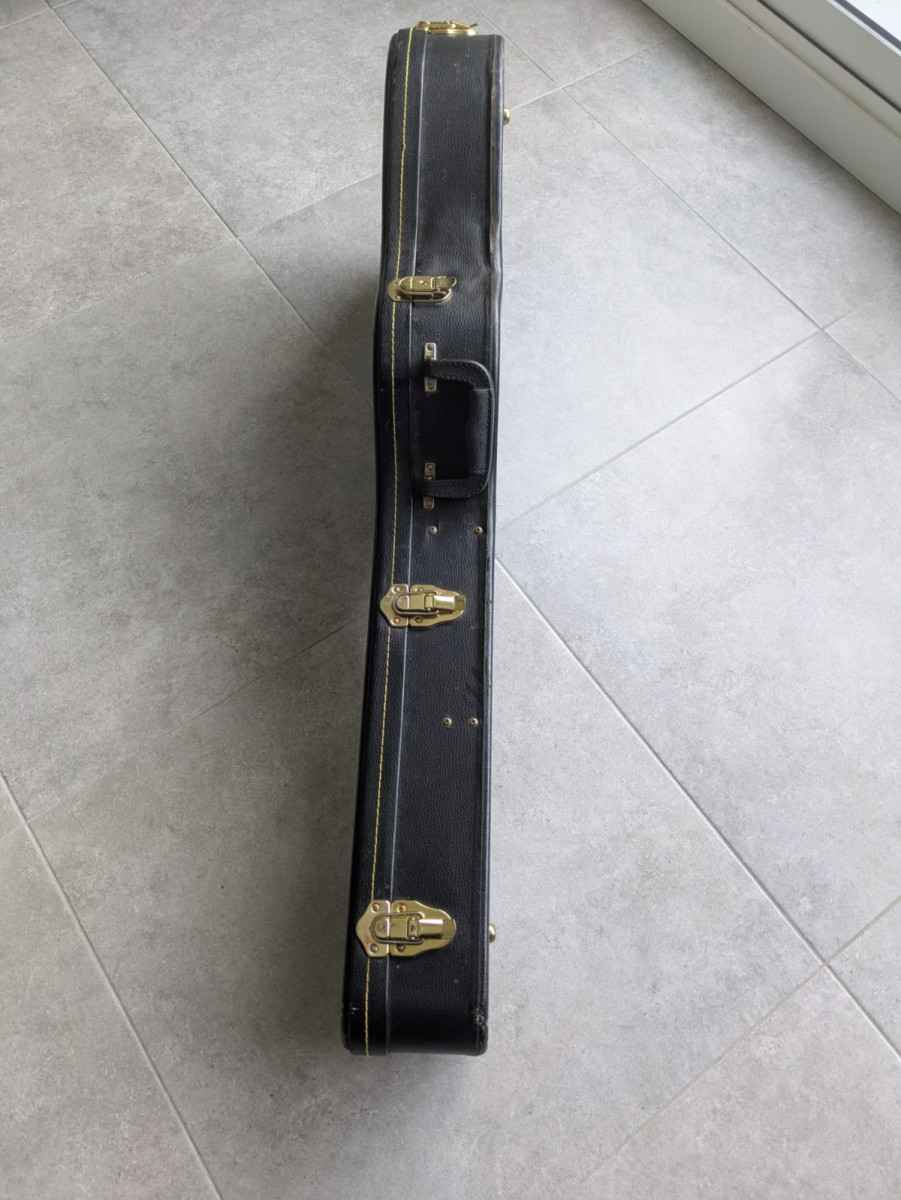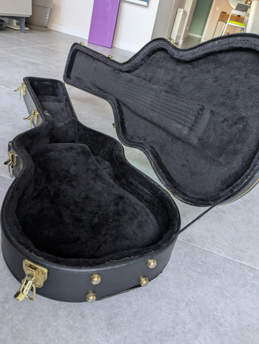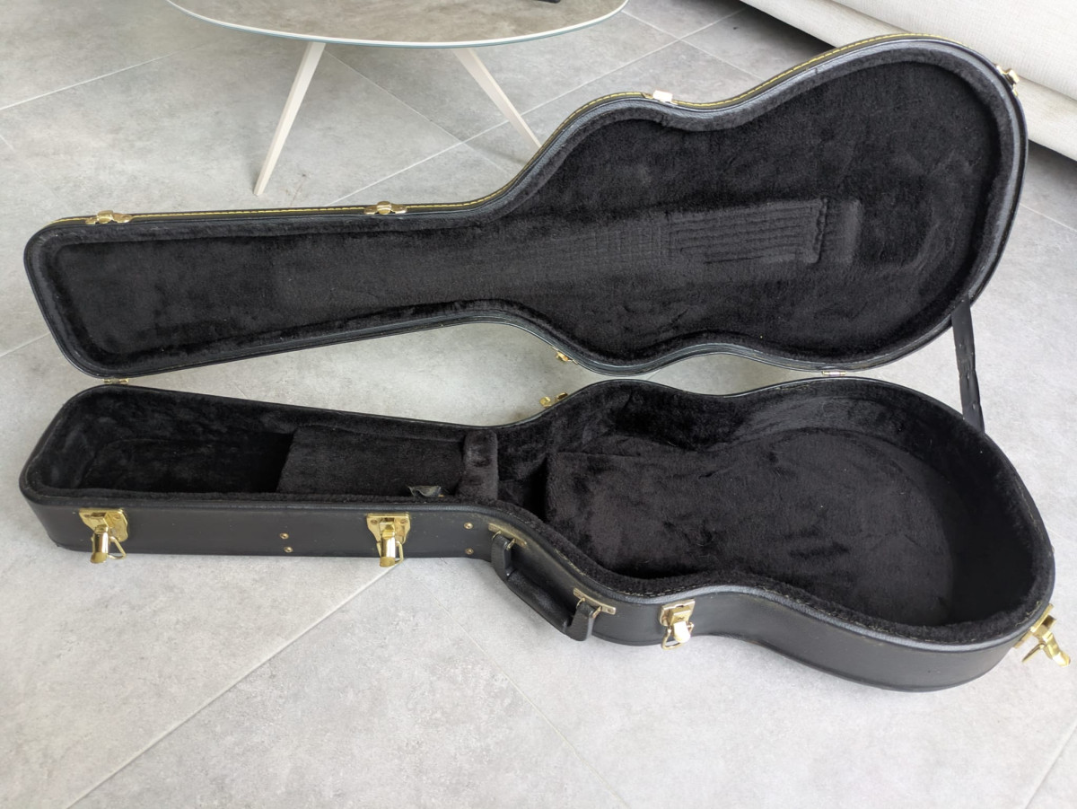 me ha llegado este estuche con una les paul de final de los 90. evidentemente es mas antiguo,no lleva logos pero comparandolo se ve que es como los que se vendian con las Gibson con otros de los 70-80'