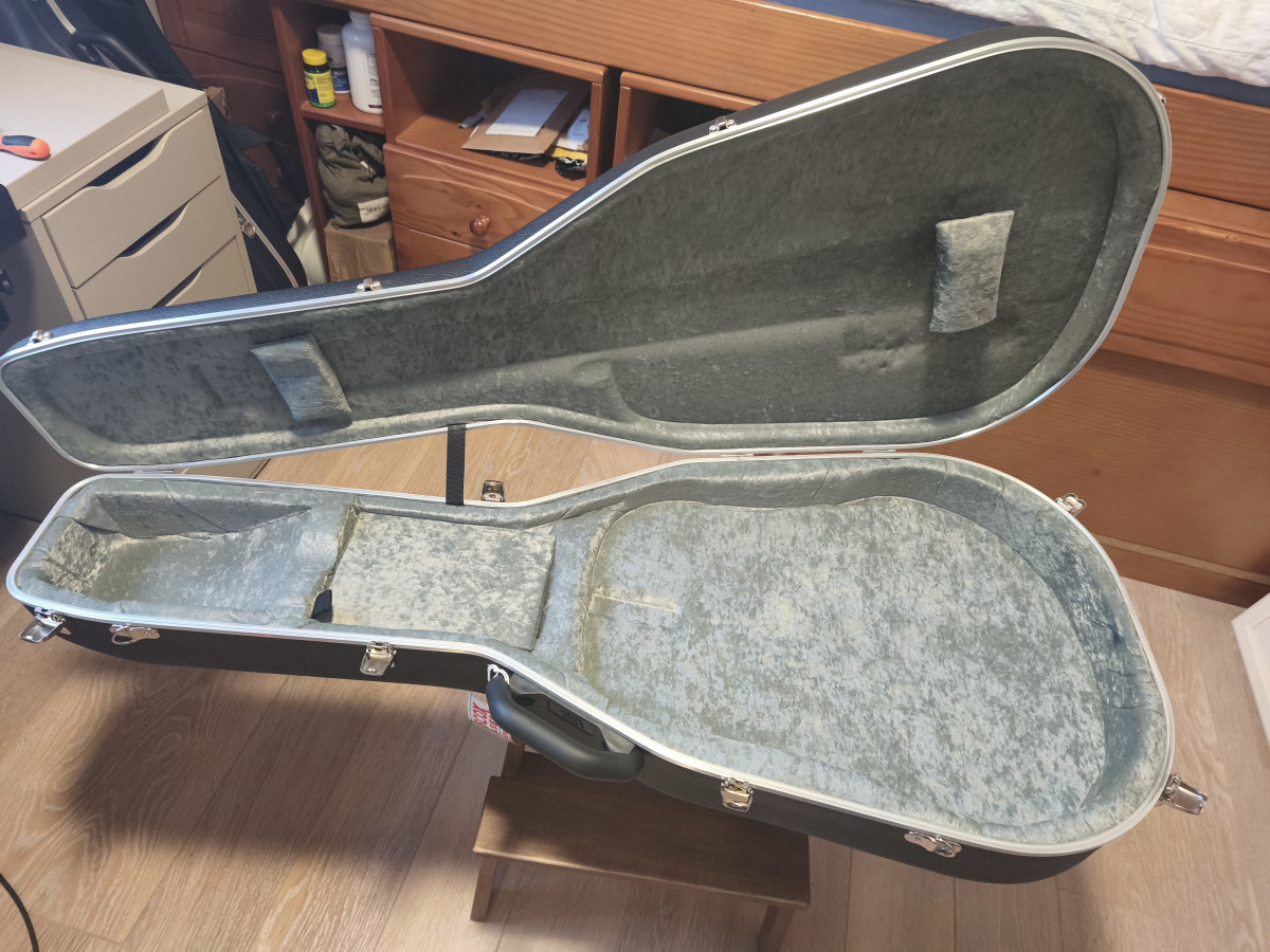 El estuche lo he usado 2 o 3 veces (De hecho todavía tiene la etiqueta colgando). Le quité la almohadilla que tiene sobre el puente de la guitarra porque lo usaba con una guitarra un poco más gruesa y no entraba (en la ultima foto se ve el apaño que hice, tú qué romper un poco la tela del interior).
