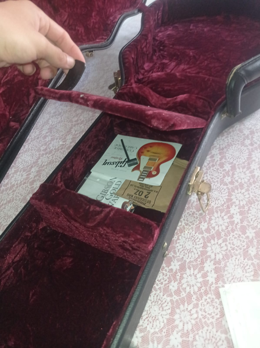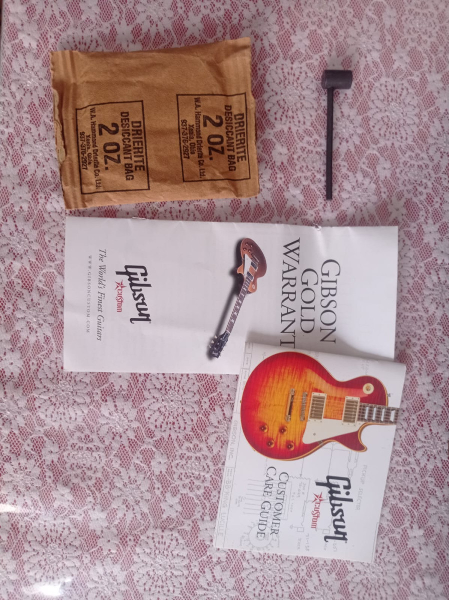 Incluye documentación original: Gibson Gold Warranty, etiqueta de control, y herramienta Allen