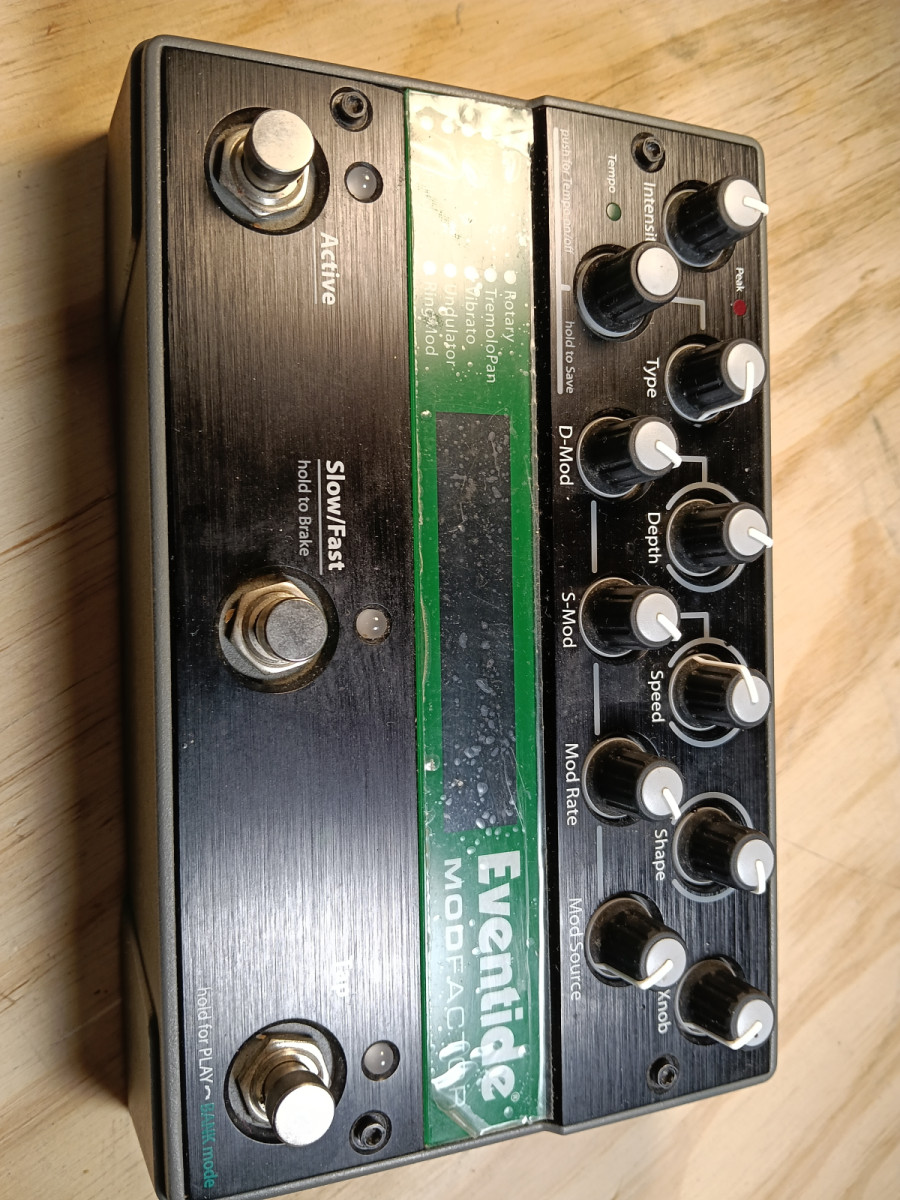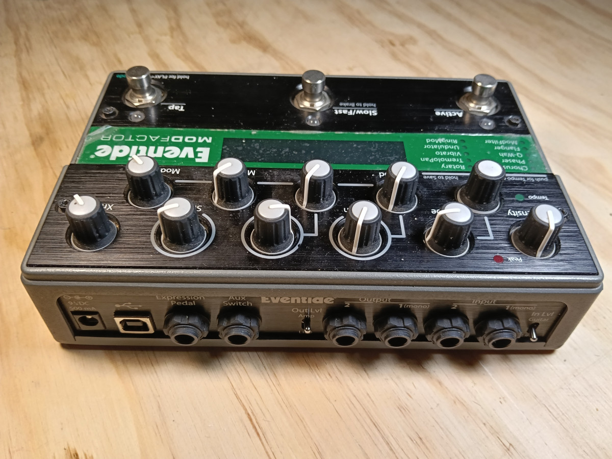 El pedal está casi sin uso, tanto que aún conserva el plástico protector de la pantalla. Viene con su fuente de alimentación original. A un gran precio puedes tener todas la modulaciones en un solo pedal con la calidad que solo eventide ofrece: calidad de estudio