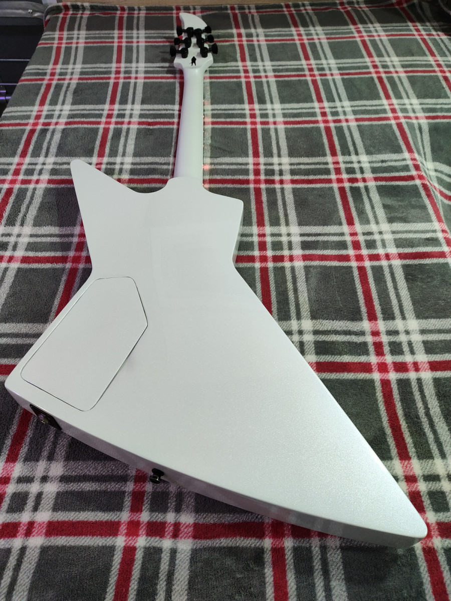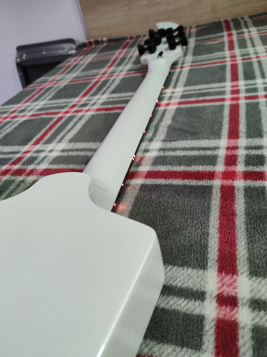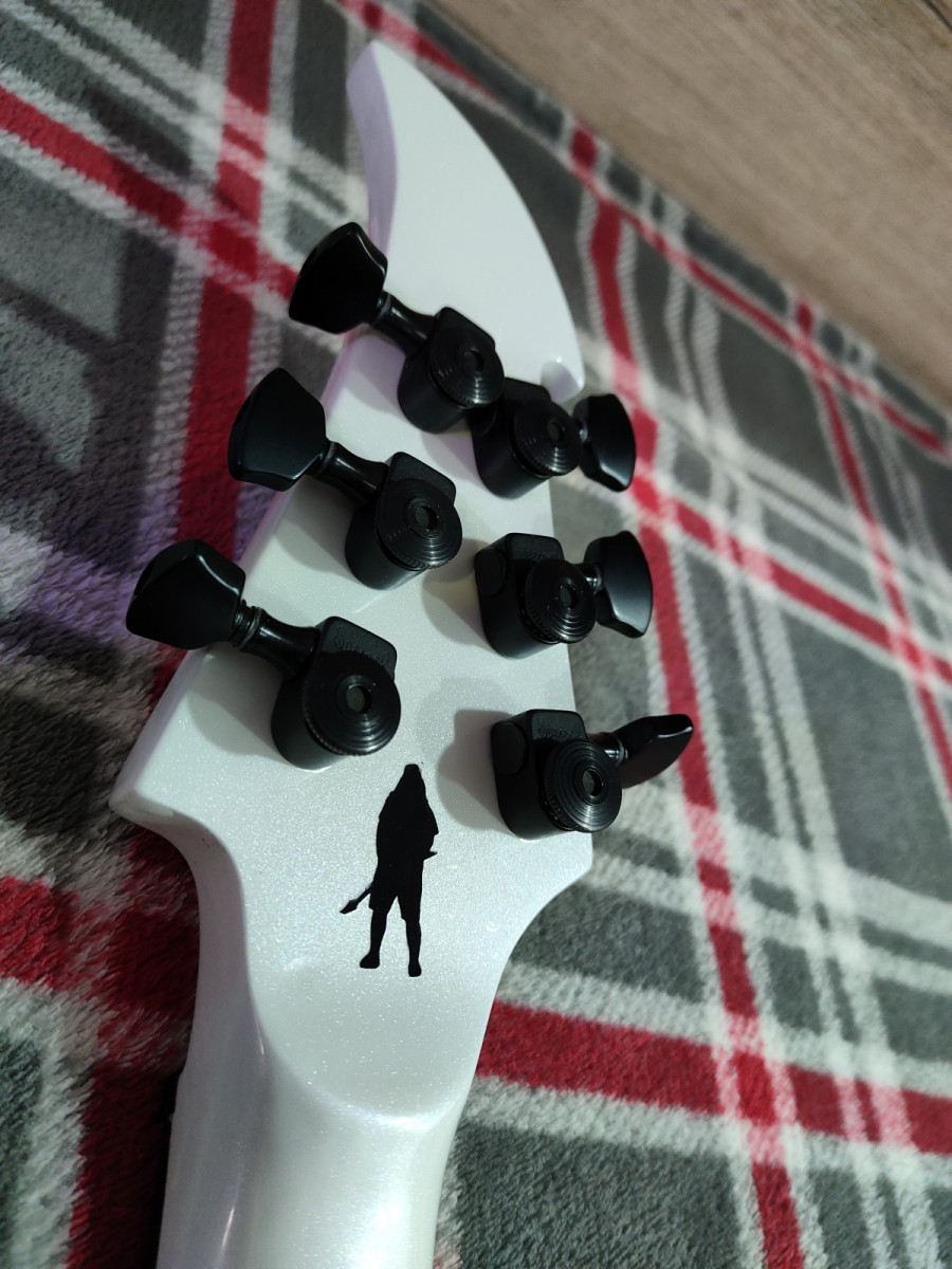 Pongo para cambio esta máquina de hacer riff, os cuento un poco, es una guitarra diseñada por KL y replicada por luthier, cuerpo de caoba, electrónica EMG 81 y Emg 60 (james hetfield antiguo) clavijeros sperzel, puente gotoh, Selector, Jack y Conmutador de Leds göldo, cuerdas 10/.46 tapa electrónica fast access pilas de 9v una para los led y otra para las pastillas, diapasón inlays de SOL, color blanco perla