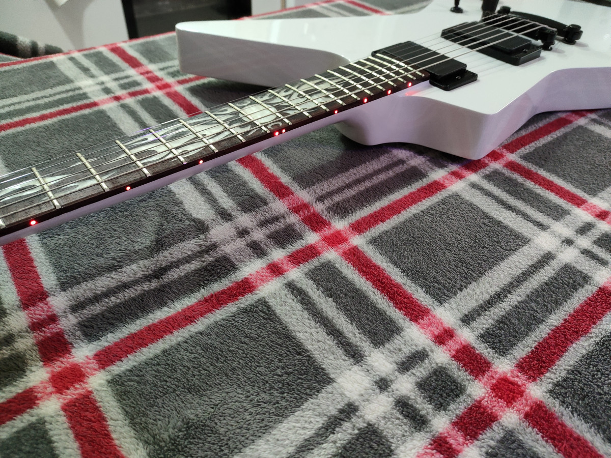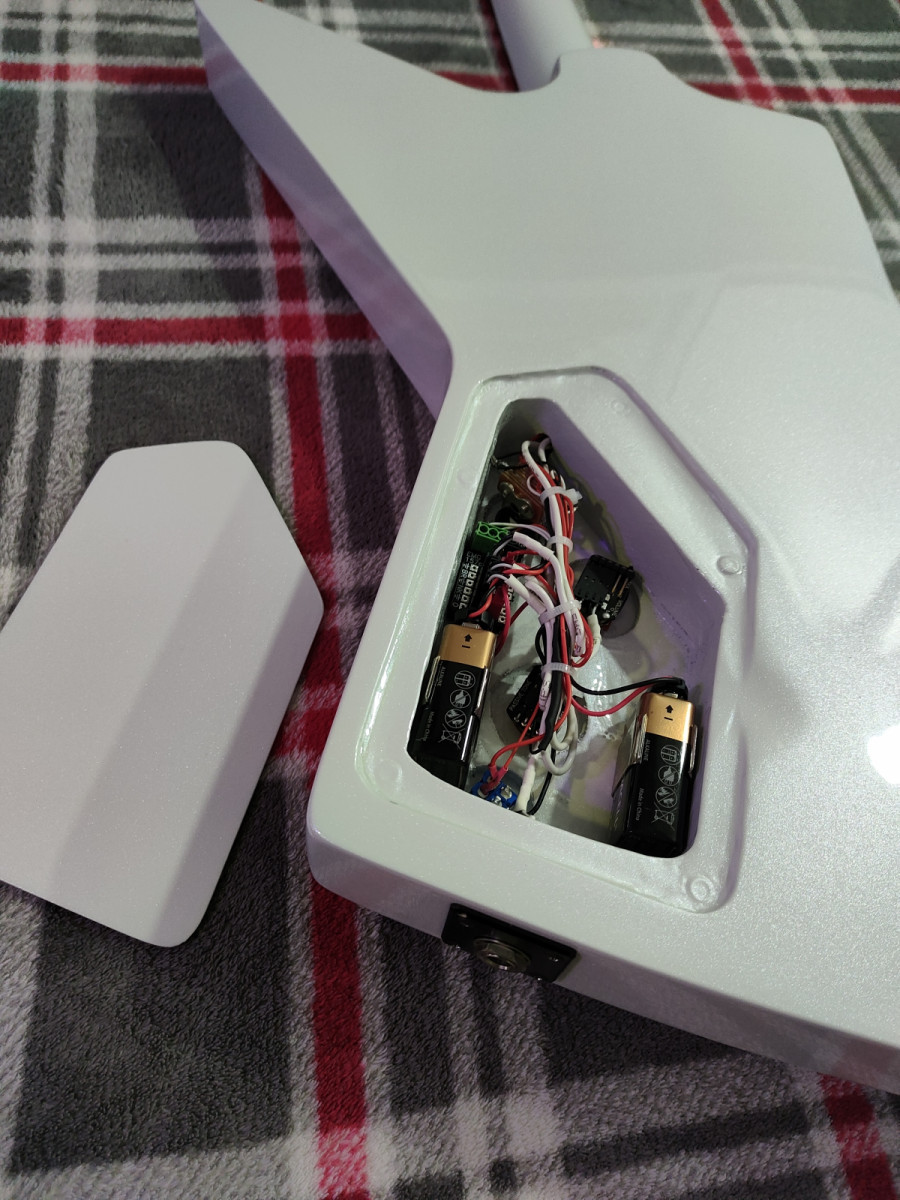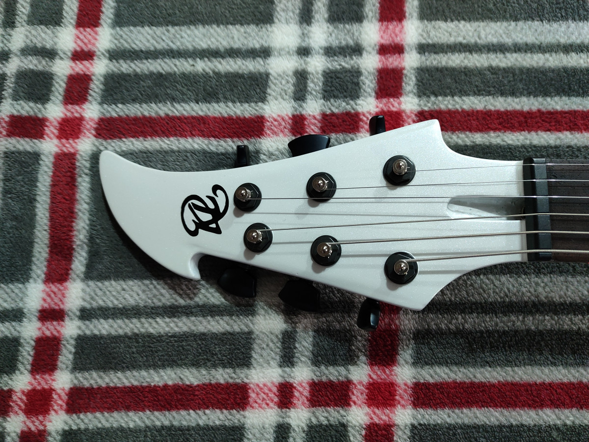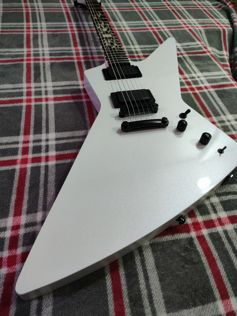 Pongo para cambio esta máquina de hacer riff, os cuento un poco, es una guitarra diseñada por KL y replicada por luthier, cuerpo de caoba, electrónica EMG 81 y Emg 60 (james hetfield antiguo) clavijeros sperzel, puente gotoh, Selector, Jack y Conmutador de Leds göldo, cuerdas 10/.46 tapa electrónica fast access pilas de 9v una para los led y otra para las pastillas, diapasón inlays de SOL, color blanco perla