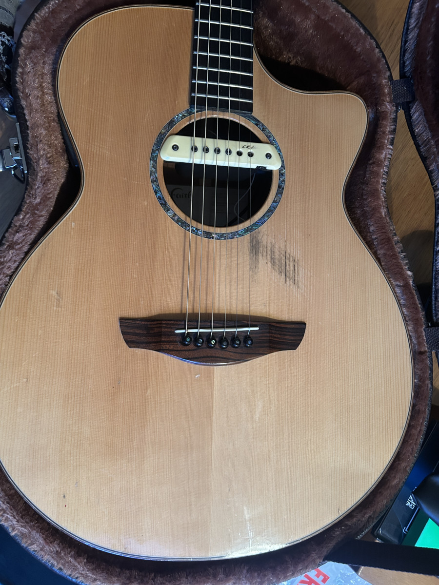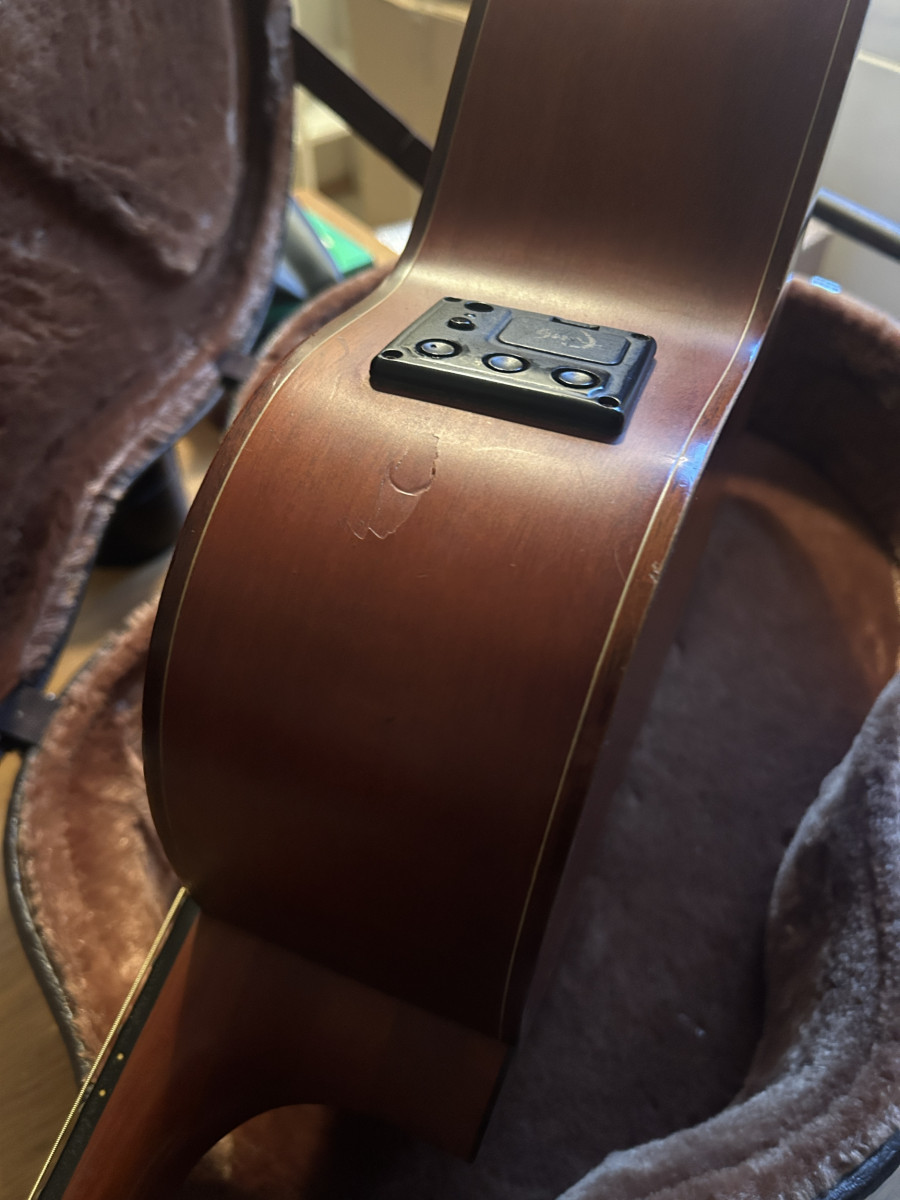 La guitarra ha visto muchos conciertos y giras, pero por motivos de mudanza he decidido venderla. Lleva instalada una pastilla LR Baggs M1 Active, ya que su sistema piezo original no funciona. Hace un par de años también actualicé la cejilla por una nueva Tusq.