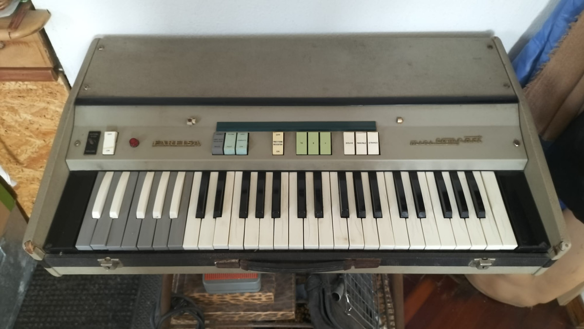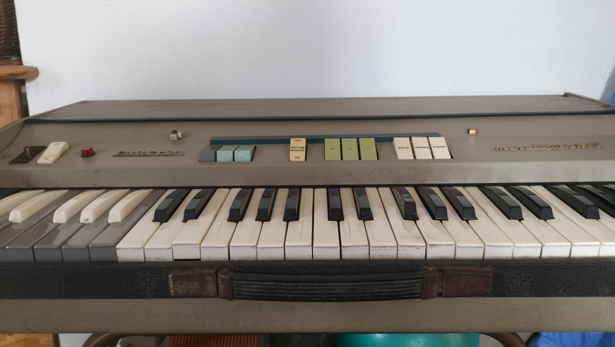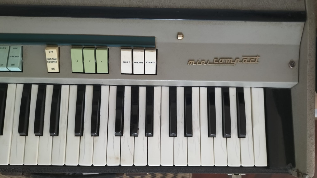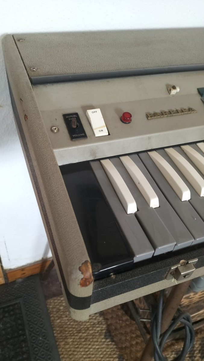 Clásico órgano Italiano de mitad de los 60's. Puedes escucharlo en infinidad de bandas clásicas de la época de todo el mundo haciendo de su sonido agresivo y estridente todo un sello de identidad. Tiene algún toque de uso sobre todo en la tapa y le falta una pata original.