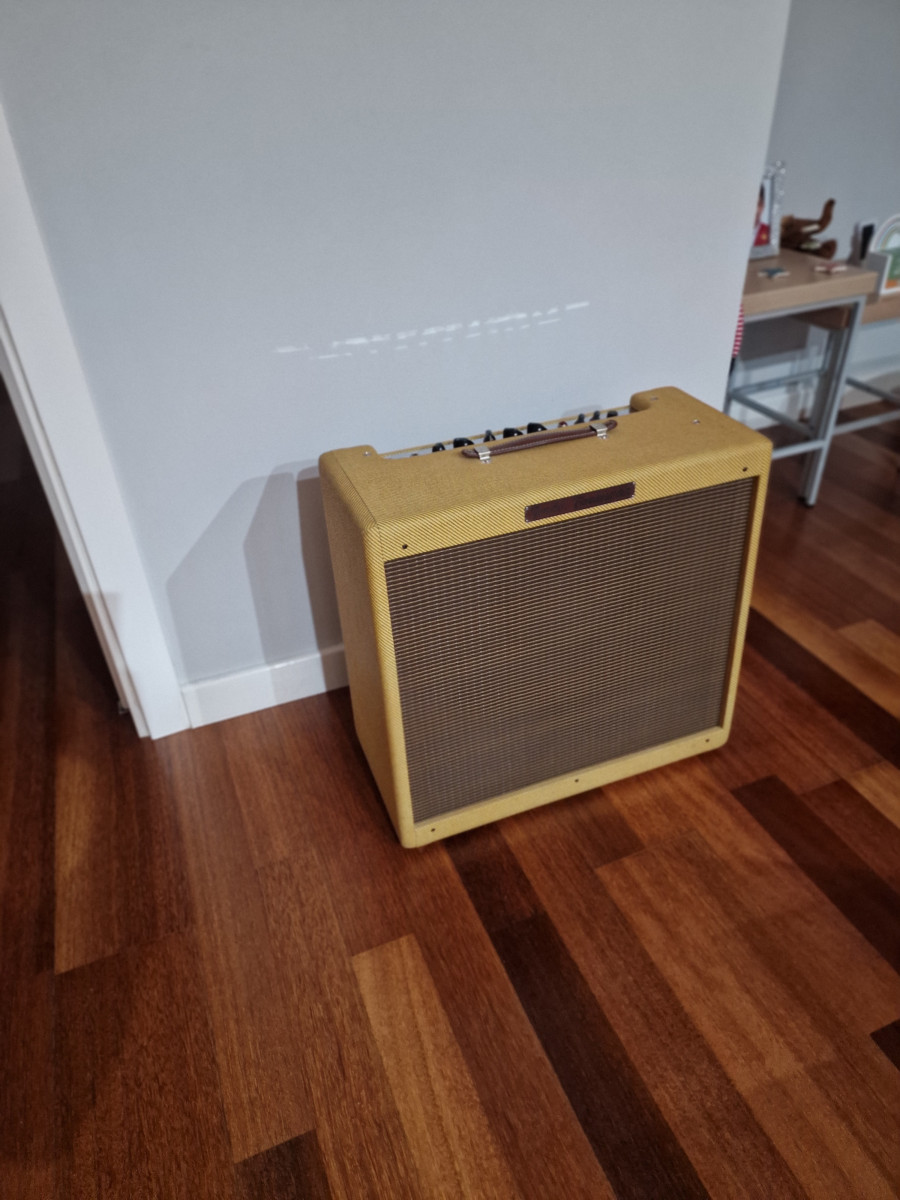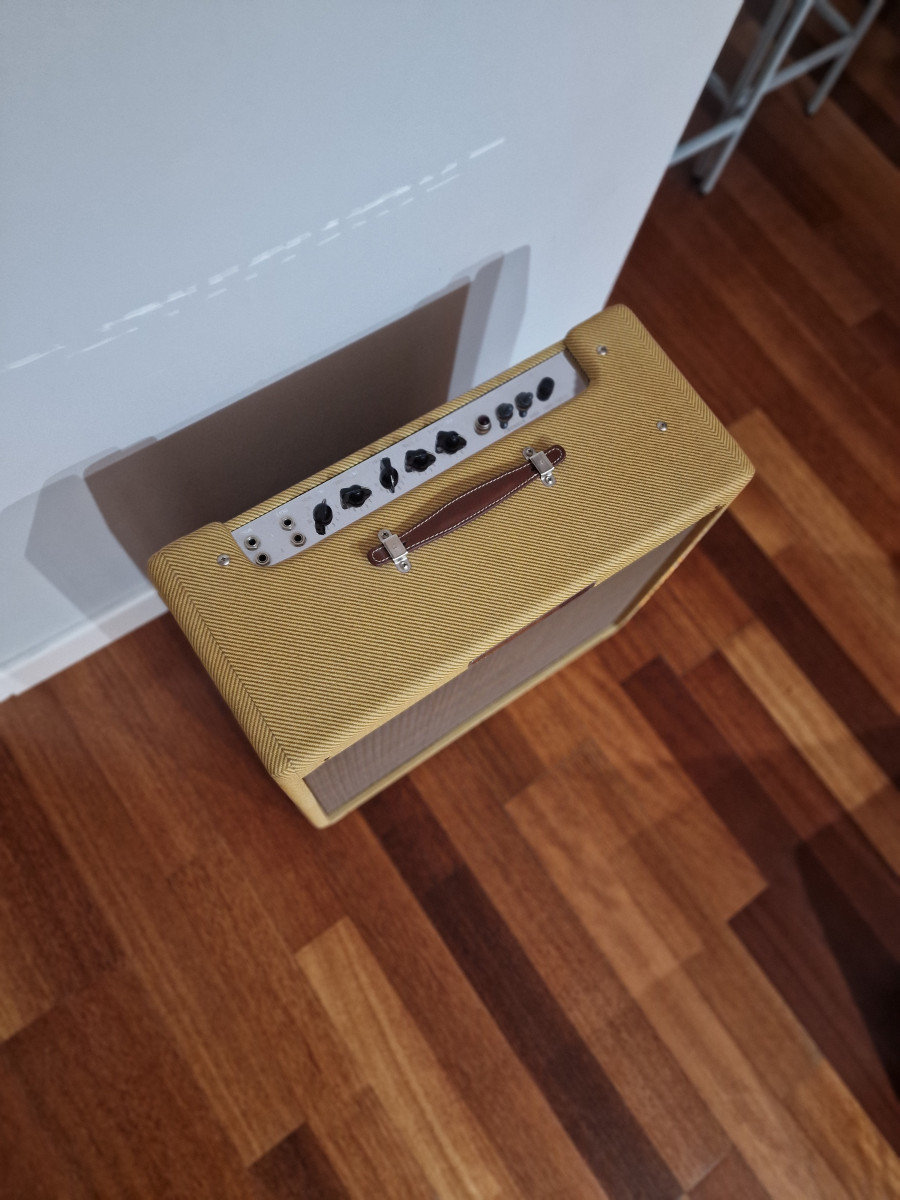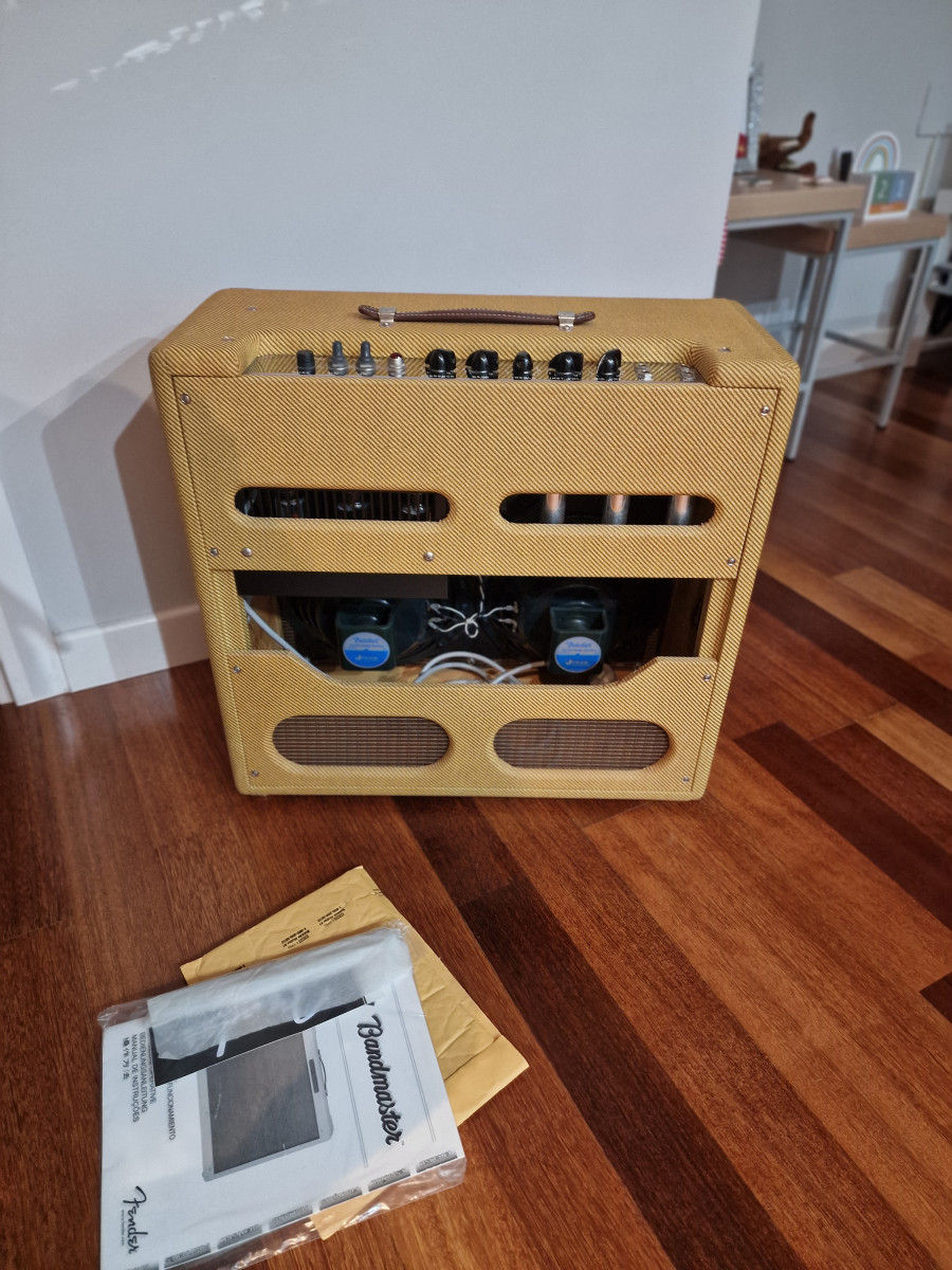 El amplificador para guitarra Fender Bandmaster de finales de los años 50 con recubrimiento tweed combinaba una imagen espectacular con un sonido dulce y un potente rendimiento. Los modelos vintage son escasos y muy codiciados, pero éste está considerado entre los guitarristas y coleccionistas como uno de los verdaderos Santos Griales de los amplificadores. Ahora, el nuevo ampli 57 Bandmaster se une a nuestra prestigiosa serie Custom, con un circuito a válvulas cableado a mano y unos componentes de primera categoría. Hemos reproducido fielmente el circuito clásico 5E7, que produce aproximadamente 26 vatios a través de tres altavoces con imán de alnico de 10 y hemos reclutado a Jensen® para ayudar a crear el controlador P10R-F (exclusivo de Fender), que se caracteriza por su respuesta cálida y sensible. Los sonidos armónicamente nítidos y ricos del amplificador Bandmaster son ideales para los estilos más vintage del rock, del blues y del country y su tono saturado natural y sensible al tacto ofrece un sonido de lo más electrizante, especialmente cuando se sube a tope. Características: