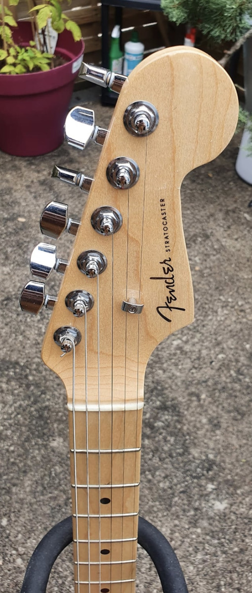 color Sky Burst Metallic.cuerpo de aliso.Mástil de arce en forma de C a D. médium Jumbo Frets.Escala 25.5”. Radio diapason 9.5”-14”. 22 trastes.Cejuela de hueso sintético.perloid dots.Clavojas afinación Fender Deluxe Cast locking.La tapa y los controles de tono y volumen han sido modificadas de blanco retro a blanco puro.Las 3 pastillas noiseless también se han sustituido por unas Dimarzio Hs2 y Hs3, en busca de conseguir el sonido que usaba J. Malmsteen era Alcatrazz y de sus primeros 3 álbumes.Pequeño toque parte inferior.poco visible.Estuche rígido Gator incluido.
