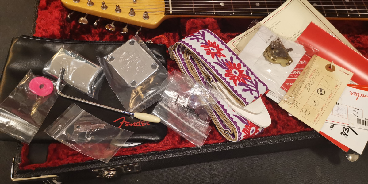 Incluye su estuche bonito como el solo (e impoluto!), todos los papeles, mariconera y demas... Como extras una placa del 75 aniversario, y una correa original Jimi Hendrix hippy como ella sola, pero bonita tambien.