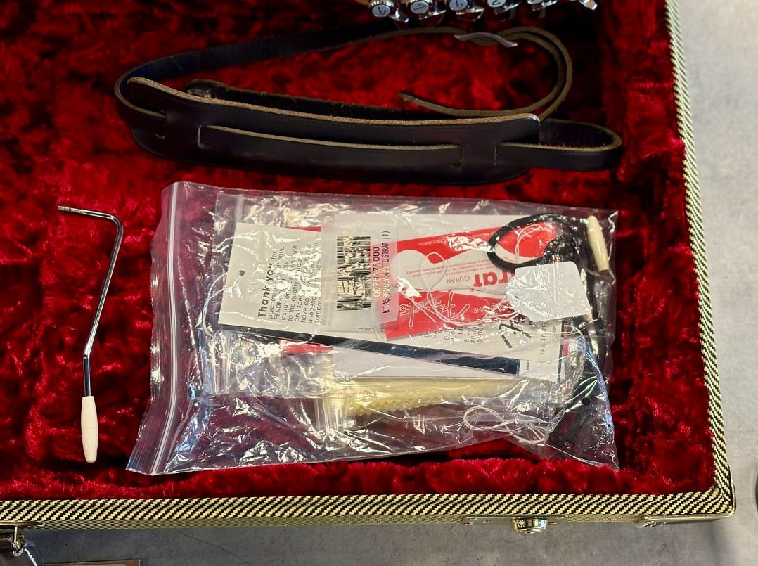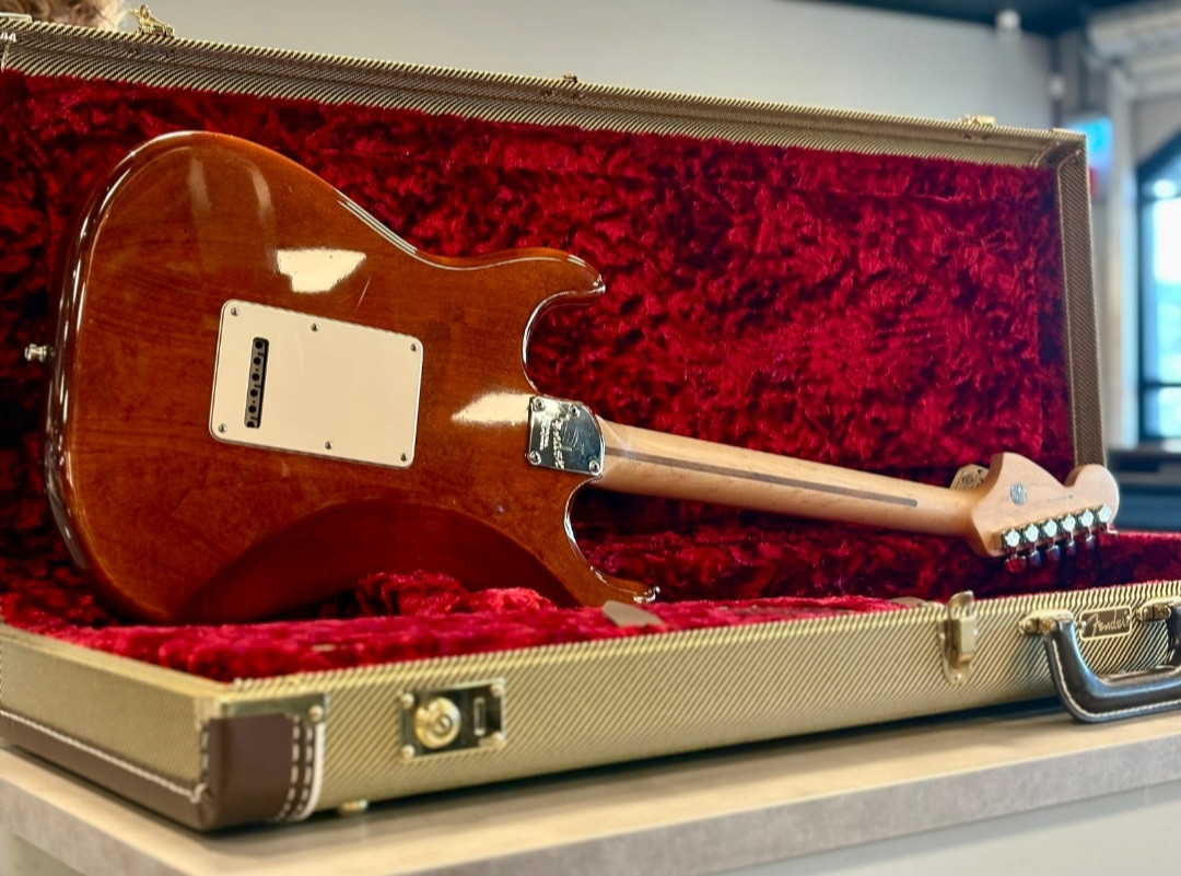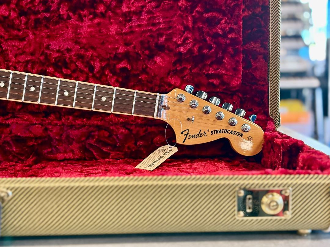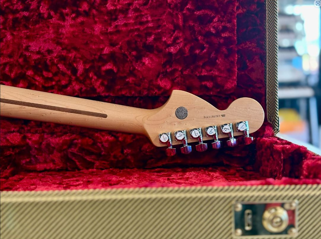 Entre otras características de primera calidad se incluyen pastillas de mástil y medios single-coil Fender Select Stratocaster, una potente pastilla del puente humbucker Twin-Head, selector de cinco posiciones, golpeador de tres capas en pergamino, botones de control en blanco envejecido, 21 trastes medios jumbo, sistema de alma Bi-Flex™, puente de trémolo sincronizado de dos puntos de apoyo estilo vintage con selletas curvadas de acero, clavijero bloqueante escalonado deluxe y medallón Fender Select en la pala.