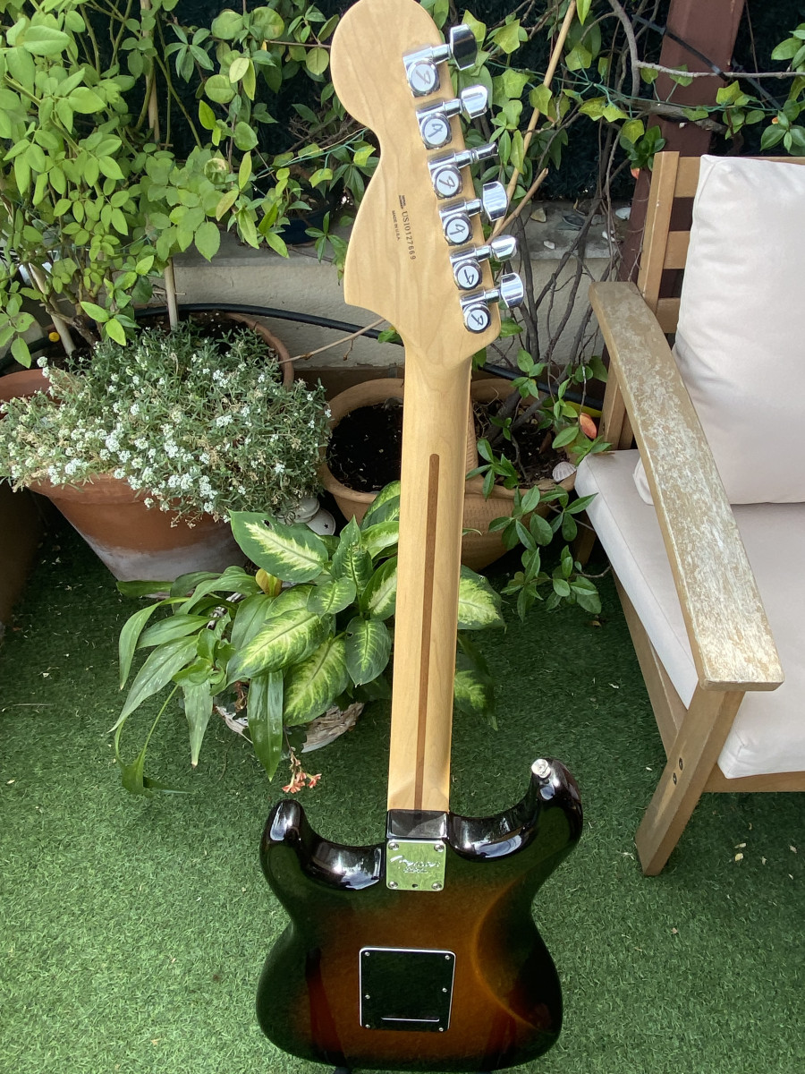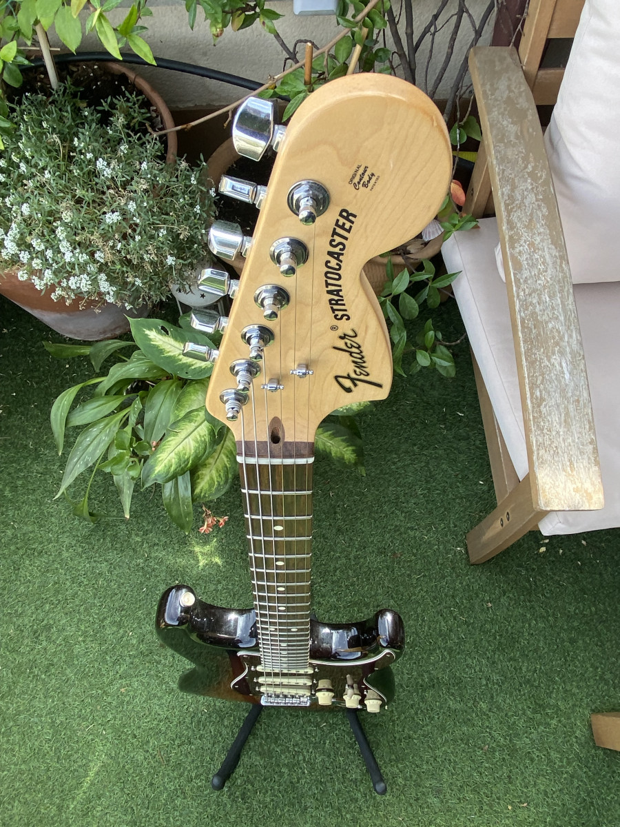 Como mejoras lleva una selleta de hueso, clavijeros Fender de bloqueo y pastillas Ultra Noiseless, que es la que montan las Ultra. El golpeador también se cambió por este para tres singles: la guitarra viene ruteada con espacio para una doble en el puente. Los trastes son jumbo, sin marcas, y eso es una gozada (para mi gusto). Tiene estuche Fender rectangular.