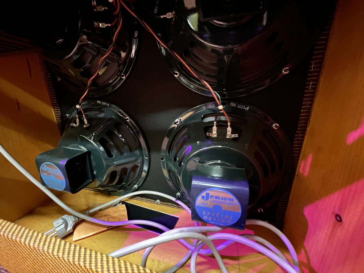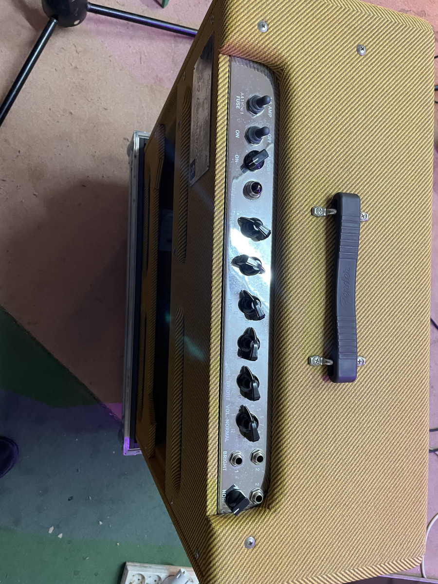 Fender Bassman en perfecto estado de conservacion. Tiene dos master volumen instalados, uno en el previo y otro en la etapa, si los pones a cero el ampli funciona de manera original. Si los vas subiendo vas aumentando ganacia con el mismo volumen, puedes elegir subirla de la etapa o del previo o ir mezclándolos a tu gusto. Flight case impoluto a medida.