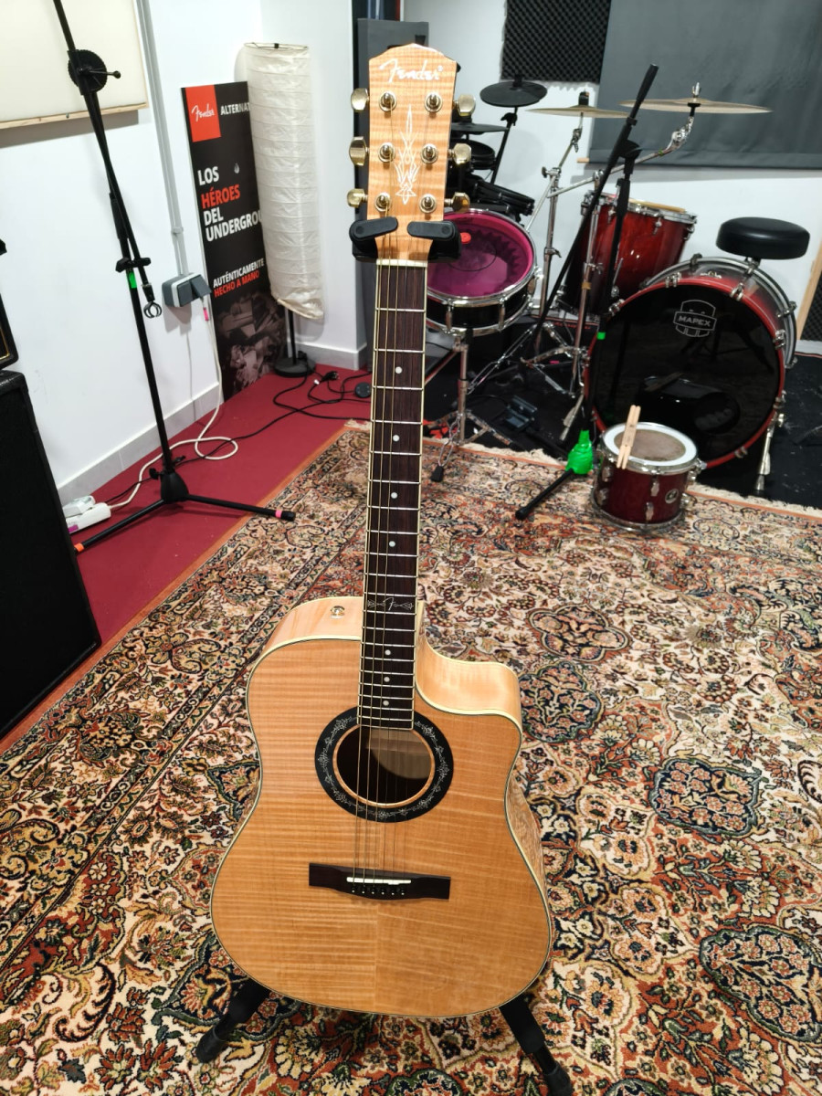 Guitarra acústica Fender California T-Bucket 400CE en buenas condiciones y acción baja. Ideal para principiantes y músicos experimentados.