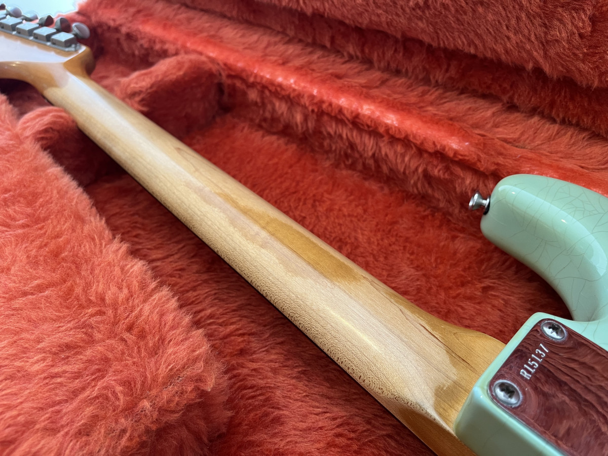 El acabado Surf Green en laca nitrocelulosa muestra un precioso craquelado ("checking") natural que le da un carácter inconfundible. Equipada con pastillas single coil Custom Shop, mástil de arce con diapasón de palorrosa tipo slab board, y puente trémolo vintage, esta Strat ofrece un tono cristalino, dinámico y lleno de matices, ideal tanto para estudio como para directo.
