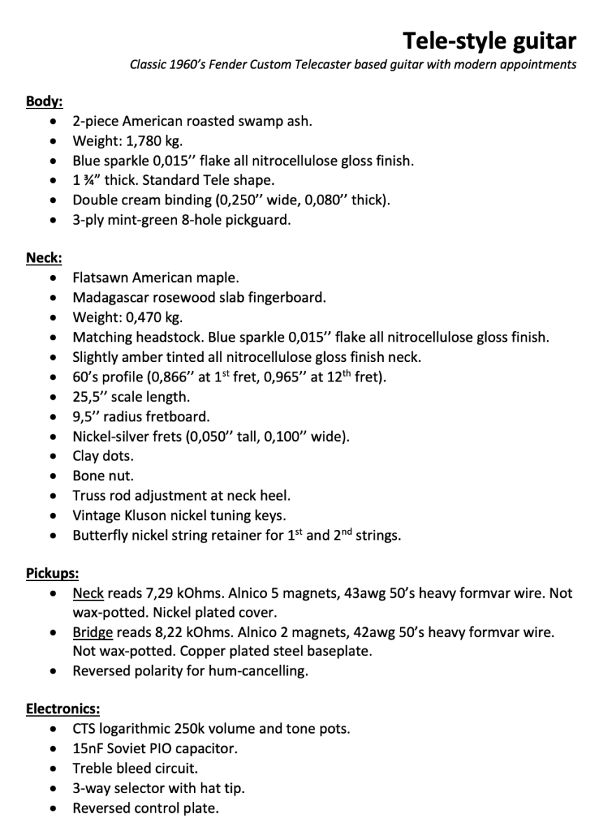 Vendo esta guitarra hecha a medida por algunos de los mejores luthieres de España con materiales excepcionales. Está basada en una Fender Custom Telecaster de principios de los 60, con algunas particularidades y detalles a destacar: