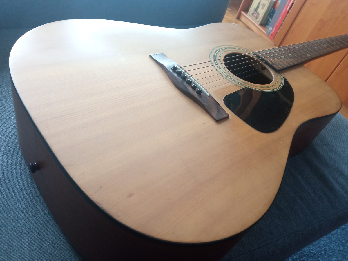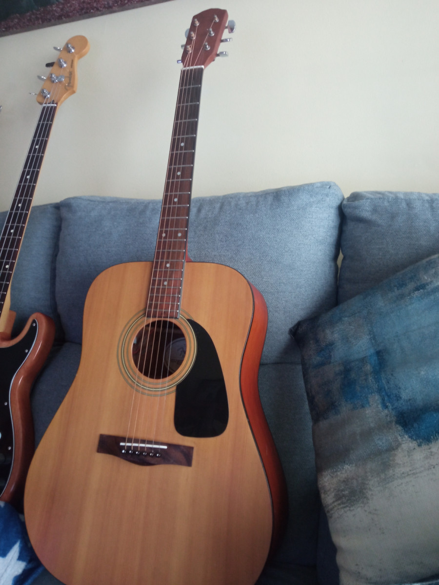 Vendo esta electroacústica Fender DG-17EM fabricada a mediados de los 90 en Korea. La guitarra tiene sus marcas y desgaste como es normal para sus 30 años, pero nada a destacar. Se toca bien, para mi gusto nada que ver con las gamas económicas de Fender de ahora. La tengo hace unos 15 años y me da pena pero no la toco y tengo muy poco espacio. Podría interesarme un cambio por un combo de bajo pequeño para tocar en casa, de calidad aceptable, aunque haya que hacer ajuste económico.