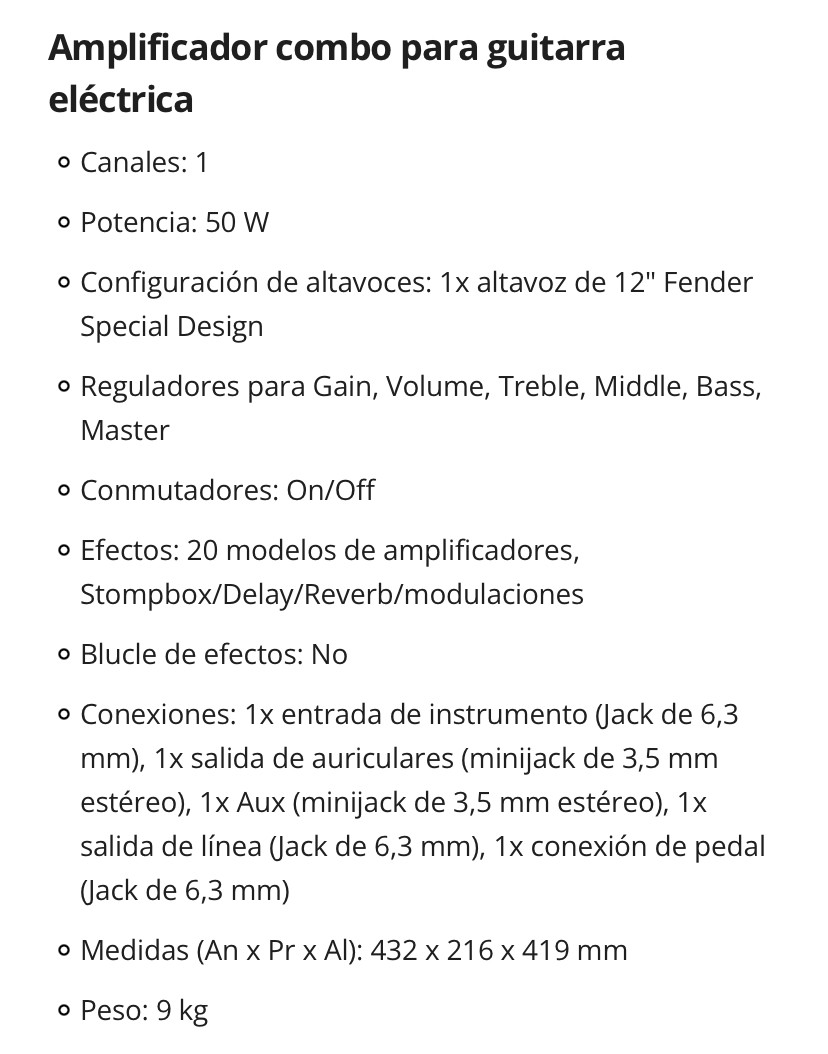 - Muchas posibilidades para la práctica, efectos integrados, 60 presets, 25 efectos, pantalla a color, USB para PC, compatible con Fender Tone. Comunidad web.