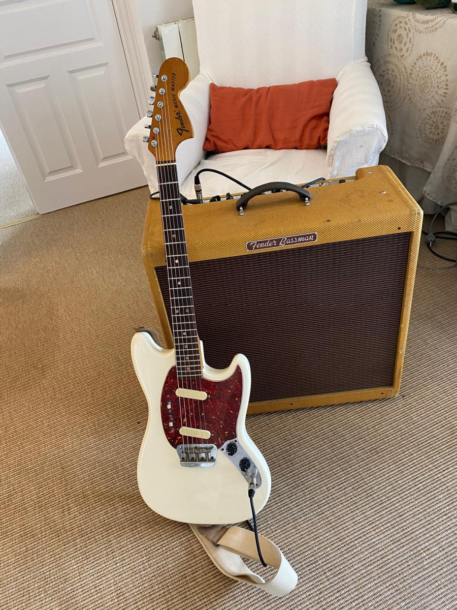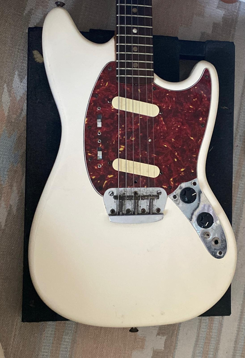 Vendo esta Fender Music Master que adquirí en foro guitarrista hace unos 3 años. Lo que yo sé de esta guitarra es lo siguiente: es una Fender Music Master con el mástil datado en 1973 y con un cuerpo que, supongo (no tengo datos sobre ello), es el cuerpo original repintado en blanco y con la pastilla del mástil, el puente y la placa de la electrónica originales. Es evidente que la guitarra fue reconvertida en una Mustang. Se le agregó una segunda pastilla en el puente y se le puso electrónica de Mustang, con esas múltiples variaciones en la paleta de sonidos (desde oscuros jazzeros hasta agudos chillones).
