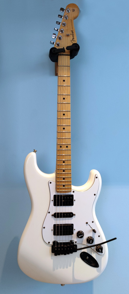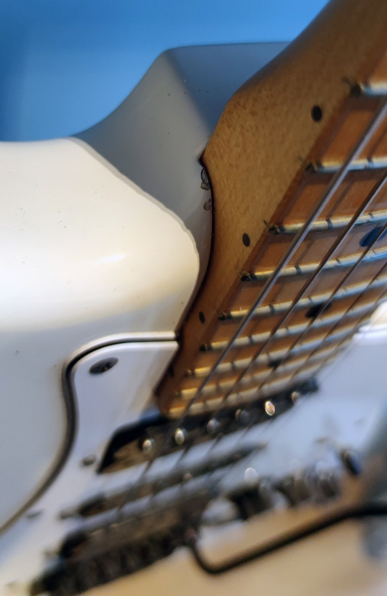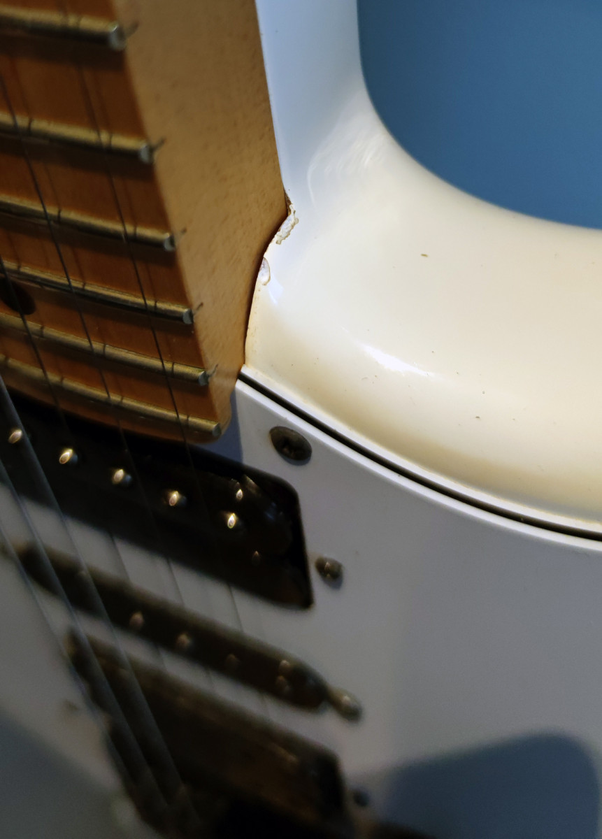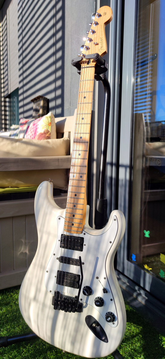 La guitarra está en perfectas condiciones, tan sólo tiene un par de dings en el cuerpo en la unión junto al mástil (ver fotos). Originalmente es una Fender Player MN PW con pastillas SSS. Pero como estas guitarras vienen ruteadas para la configuración HSH le hice algunas modificaciones:
