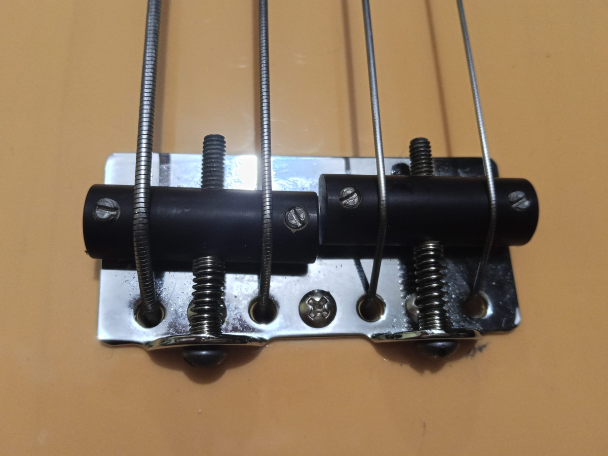 La pastilla se sustituyó por una Lollar P-Bass. Se le cambió la electrónica y se le pusieron unas selletas de baquelita. Lleva cuerdas de entorchado plano Thomastik JF344.