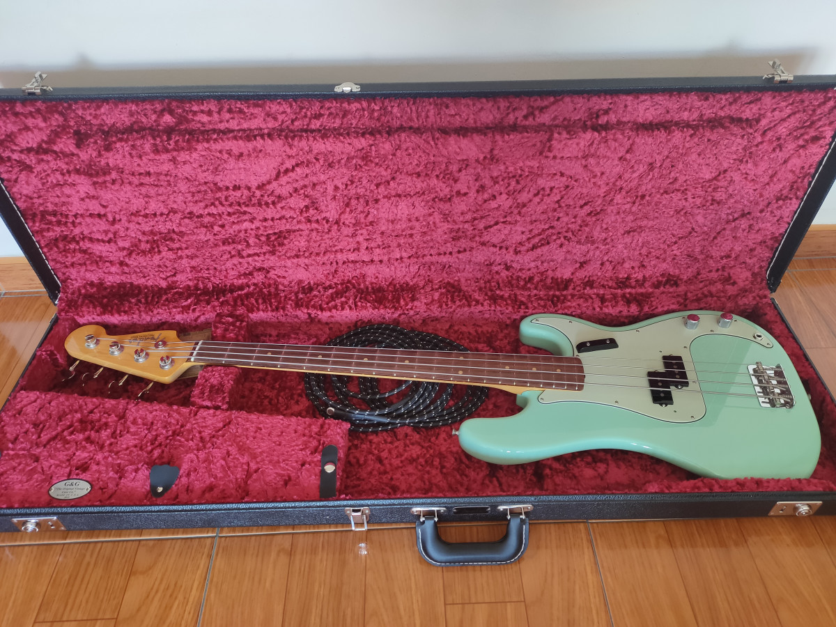 Vendo Fender Precision Bass American Original en color Surf Green con golpeador Vintage Mint original de Fender. Se incluye el estuche, los accesorios originales y el golpeador original del bajo (tortuga).