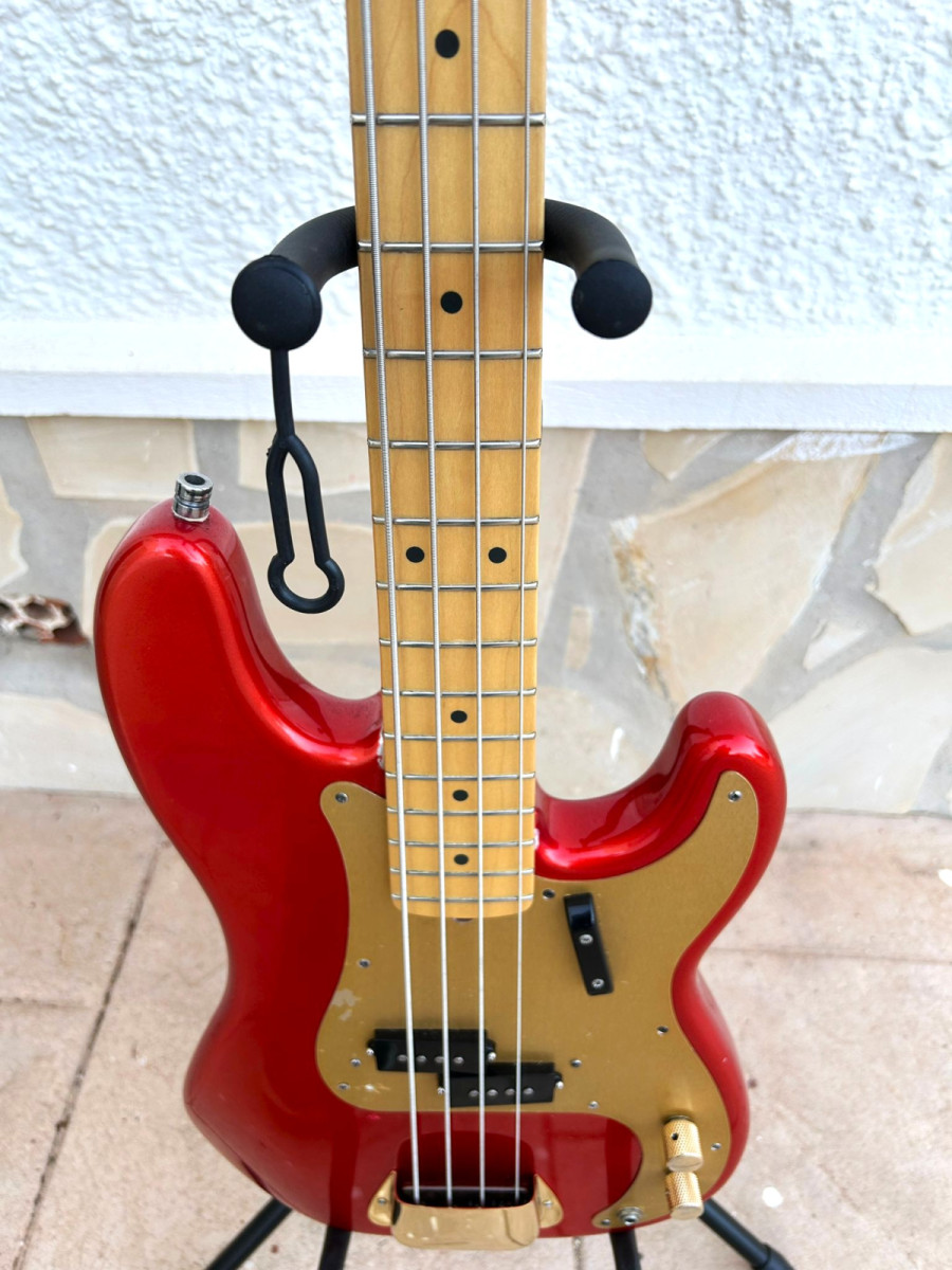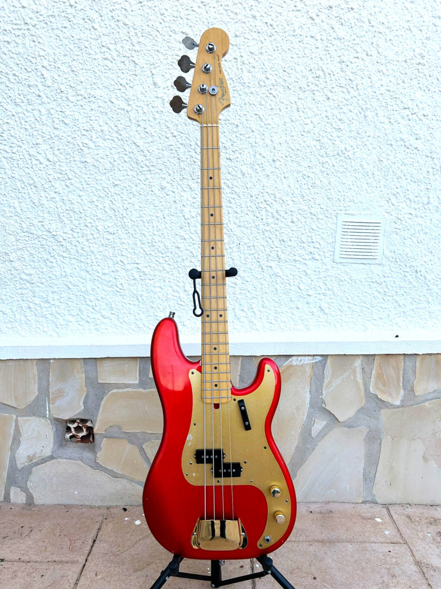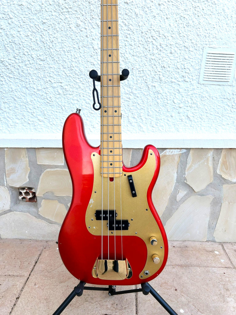 El mejor Precision que he tenido. Mastil en forma de C super comodo de arce. Color chrome red, bastante raro pero precioso, según le dé la luz se ve anaranjado o rosaceo. Pesa 4,1 en mi bascula. Todo original excepto el golpeador y complementos en dorado para darle el look 50s.