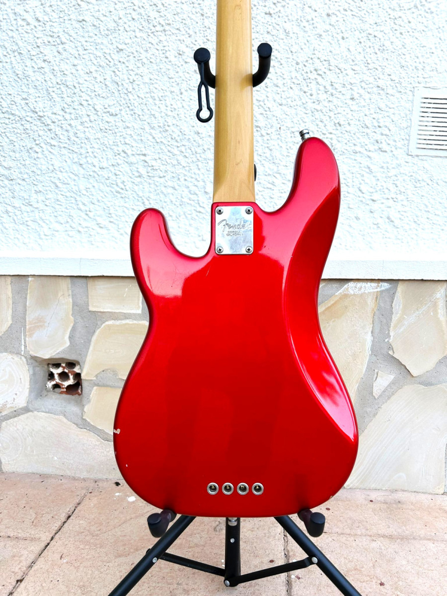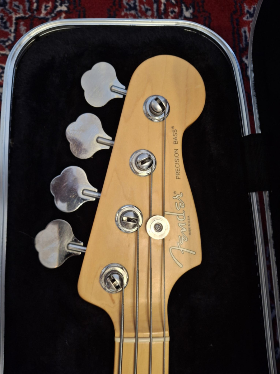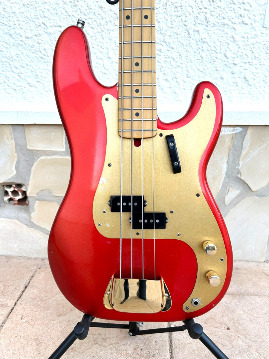 El mejor Precision que he tenido. Mastil en forma de C super comodo de arce. Color chrome red, bastante raro pero precioso, según le dé la luz se ve anaranjado o rosaceo. Pesa 4,1 en mi bascula. Todo original excepto el golpeador y complementos en dorado para darle el look 50s.