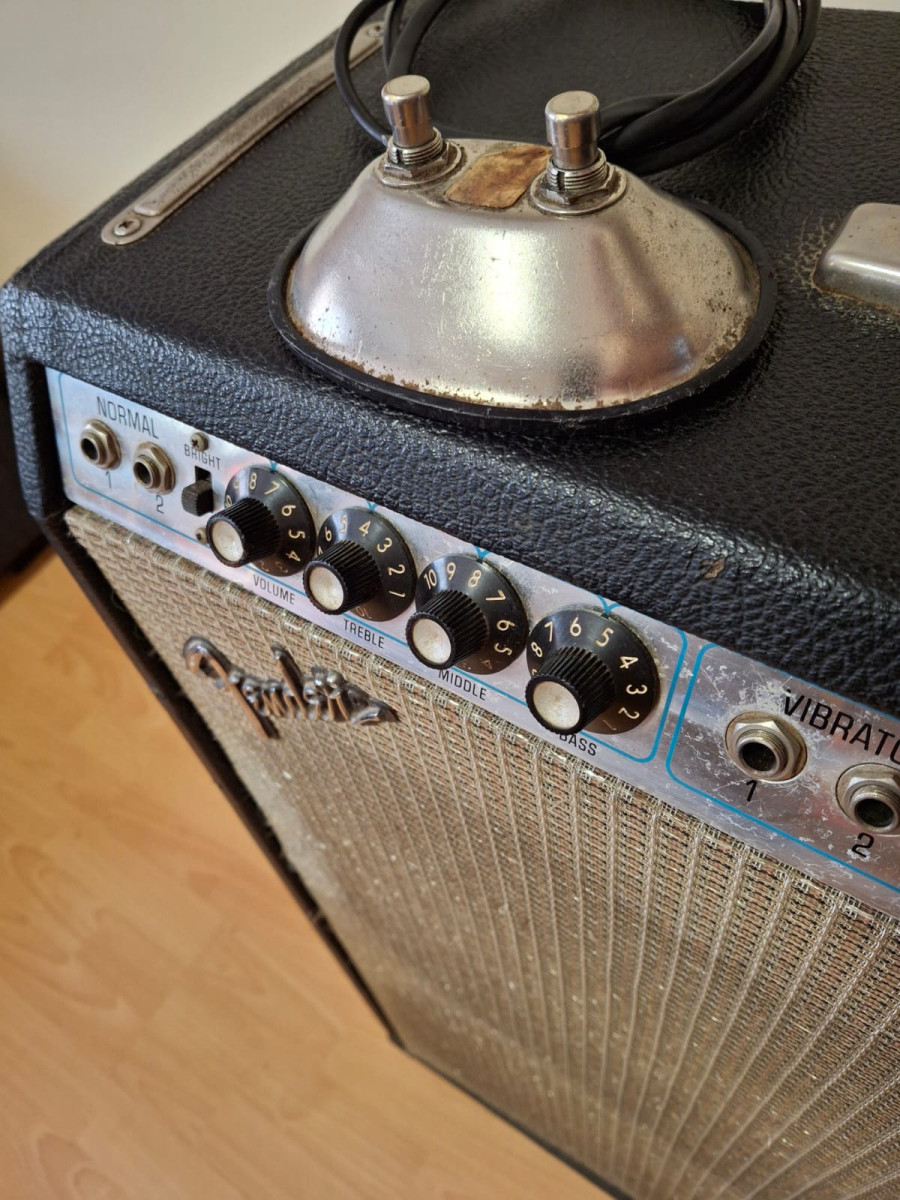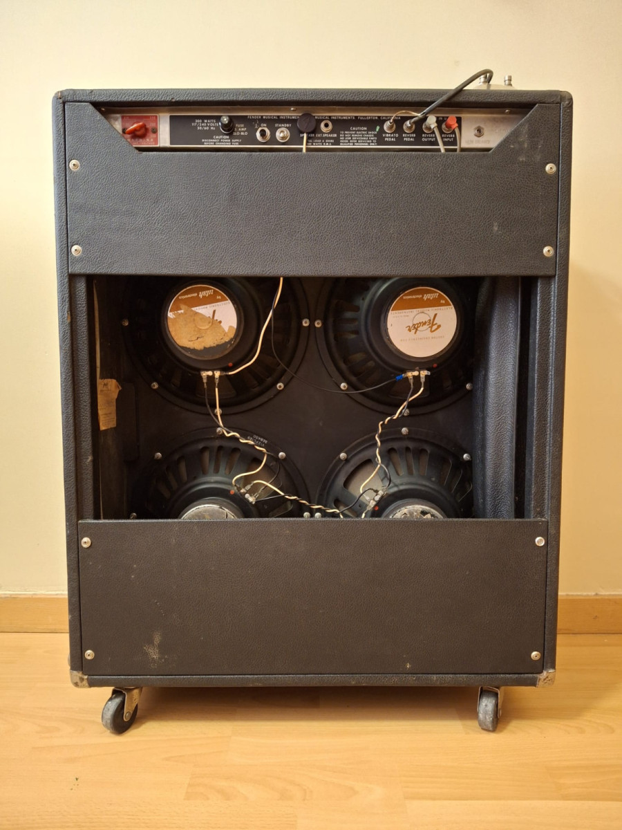 El amplificador está en perfecto estado de funcionamiento y suena impresionante: sin duda, el tono limpio más hermoso que he escuchado jamás. Subiendo los medios y atenuando un poco los agudos en el ecualizador del ampli, se traga muy bien la mayoría de los pedales, sobre todo si son overdrives transparentes.