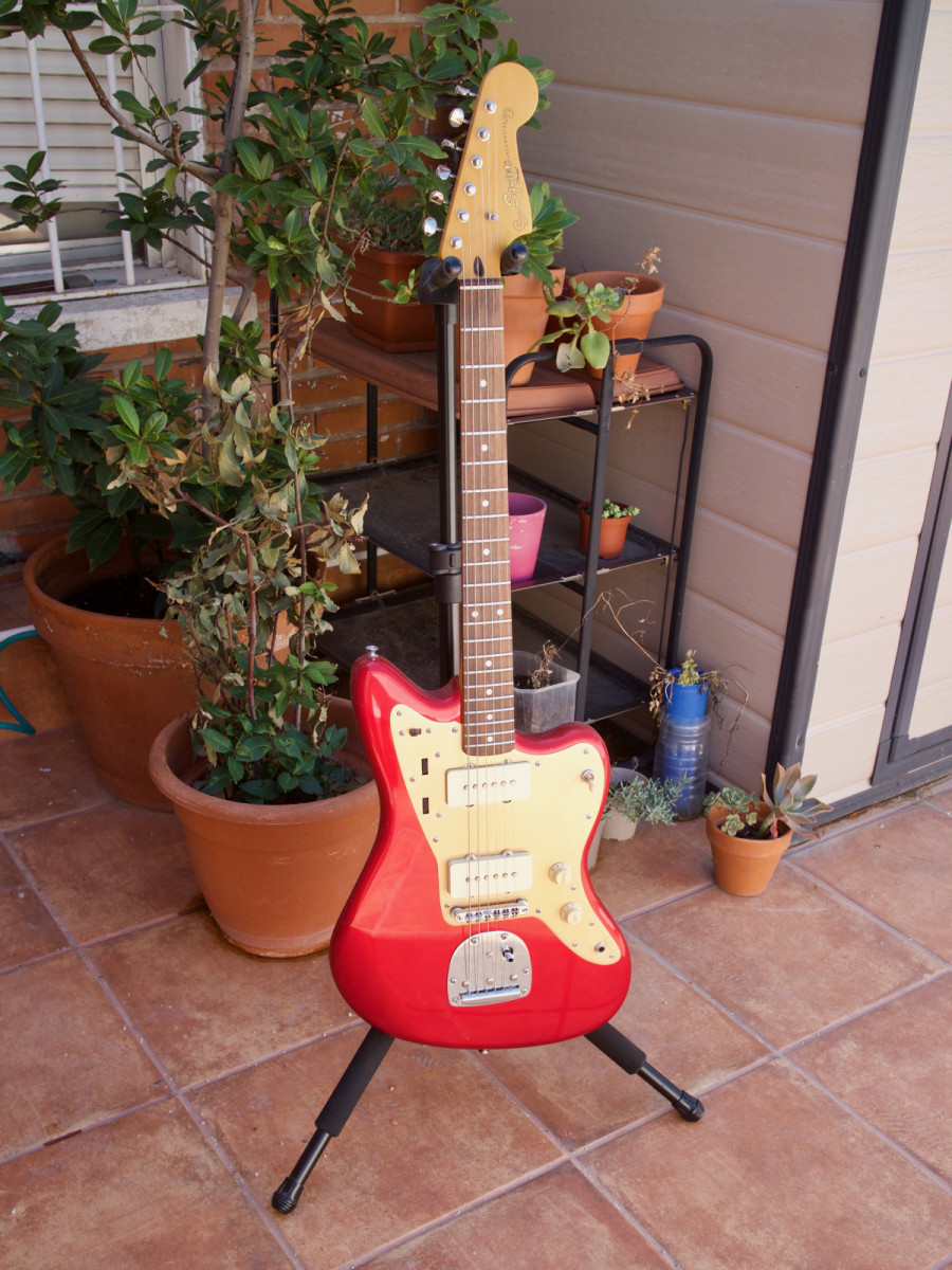 · FENDER SQUIER JAZZMASTER DELUXE (MEJORADA), similar a la J Mascis. Se ha mejorado pastillas Seymour Duncan SJM1 Vintage (coste 228€), condensadores Philips, cejuela de hueso y clavijero Klusom M6VLC Magnum Lock (coste 63€), todo por luthier (Jorge JEC / Electrónica Baile). Recientemente pasó por el mismo luthier para cambio de cuerdas (Power Slinky, 11-48), limpieza e hidratación de mástil, pulido de trastes y ajuste general (coste 103€).......... 490€