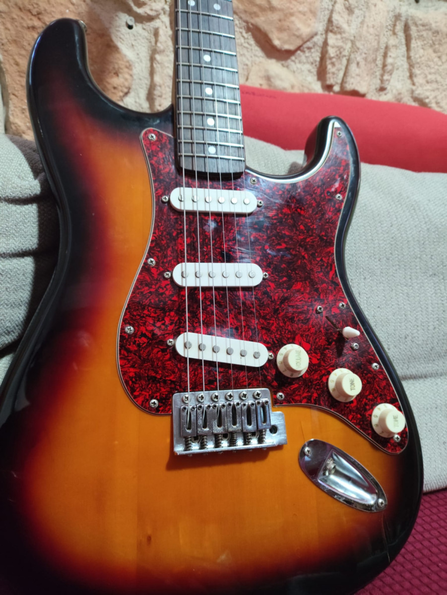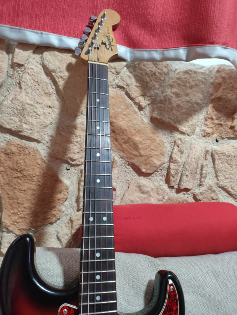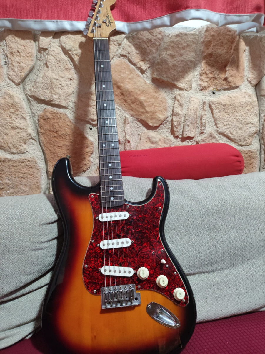 Fender Squier Stratocaster, recién ajustada, no se el modelo exacto, pero suena bien y el mástil es muy cómodo. Tiene una rayita a la altura del jack y otra por detrás