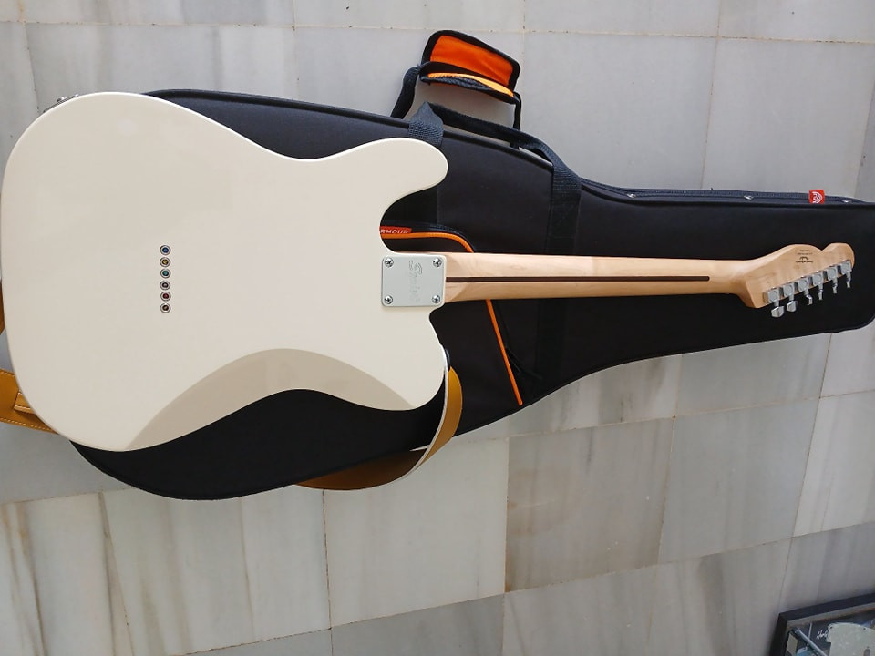 Fender Squier Standard Super vitaminada y mineralizada. Cuerpo y mástil Esquier, puente,clavijero y pastillas Fender Standard la de mástil es la original de la guitarra, se le ha cambiado toda la electrónica con potes Grandes Goldo de fabricación japonesa,condensador Orange Drop y switch de calidad, también le hemos colocado un nuevo golpeador blanco vintage Fender y entrada de Jack nueva de acero tipo Gibson junto con botonera de latón, una guitarra buena bonita y barata. Hazte con ella.