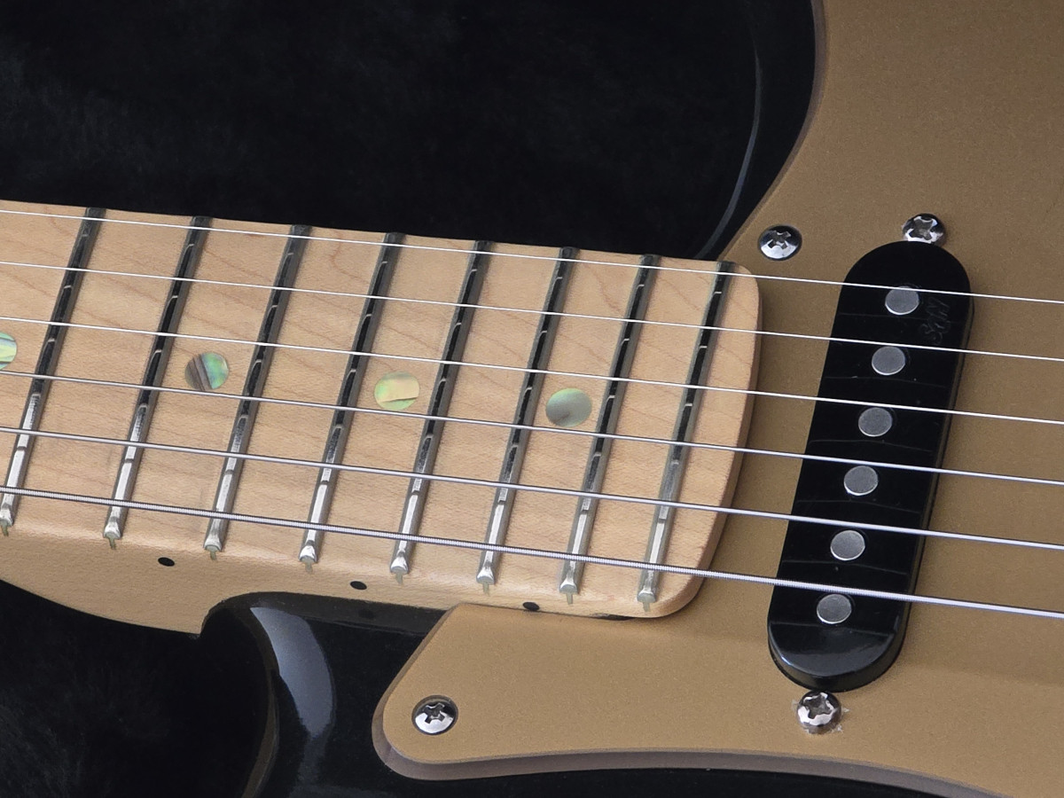 Guitarra Fender Stratocaster American Deluxe, en color Montego Black, en buen estado, con estuche original, incluye correa con enganches de seguridad Schaller, cejuela LSR Roller, clavijero con bloqueo, puente de 2 puntos, marcadores de trastes de abalone, trussrod biflex, pastillas samarium cobalt y DH1, control de volumen con switch S1, y selector de 5 posiciones, made in USA