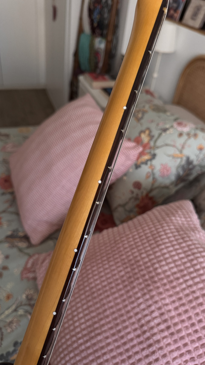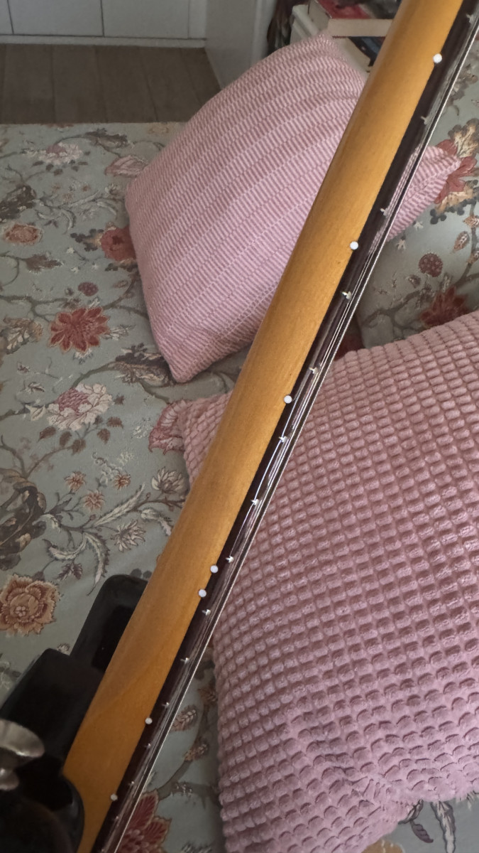Marcadores laterales de trastes 3-5-7-9-12-15-17-21 modificados a blanco en vez del color original que no se ven. (Ver foto)