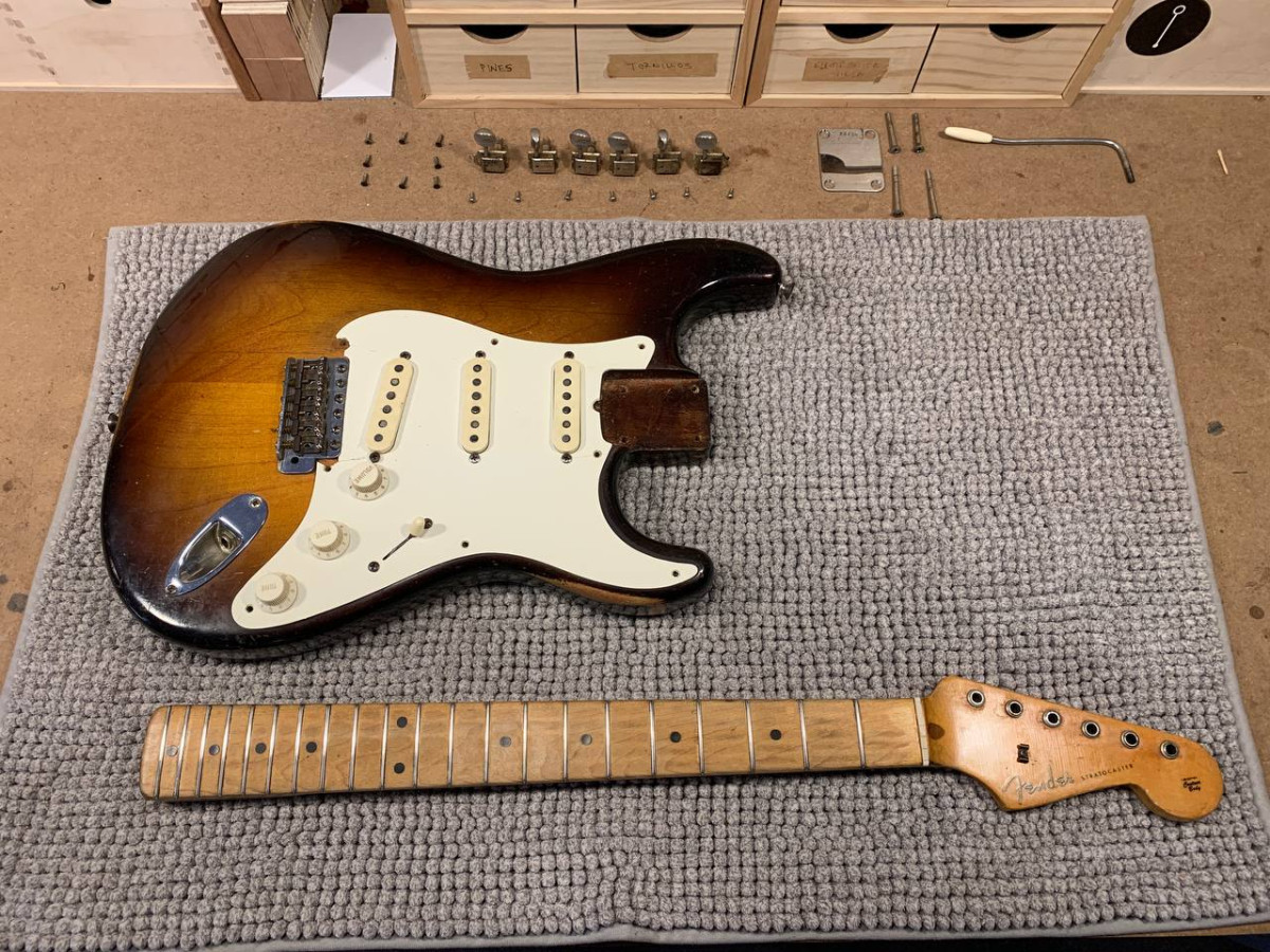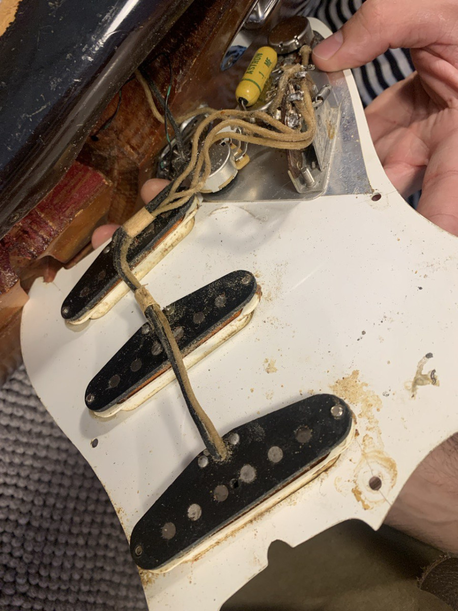 Pots date week 25 of 1958, Astron cap, 3 way switch, original pickguard with lots of cracking. Correct black bottom pickups measuring 5,85, 5,91 and 5,90 Kohm.