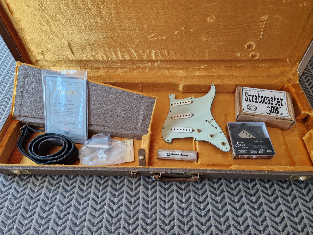 El hss lleva un golpeador hecho por Rossi, de humbucker una Suhr Thornbucker + y de single unas Brieba Loureiro que ya no se hacen y realmente difíciles de conseguir (se entrega también la single del puente que sobra).