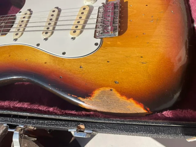 Relicada, nitro craquelada, y marcas por uso natural. Es una guitarra con años y trote.