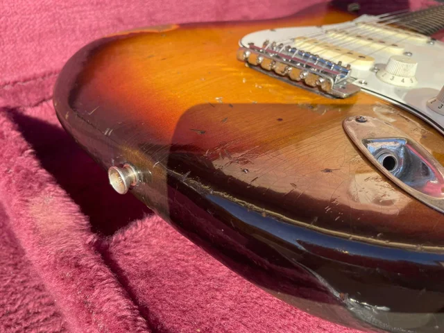 Se entrega en una maleta vintage, de los 70 con logo Fender. Es ligeramente mas larga que el tamaño de la guitarra, lo que hace difícil identificar su origen exacto. Tiene un par de cierres adicionales de reciente instalación para mayor seguridad porque los originales ya no trabajaban bien.