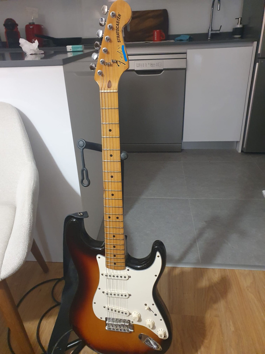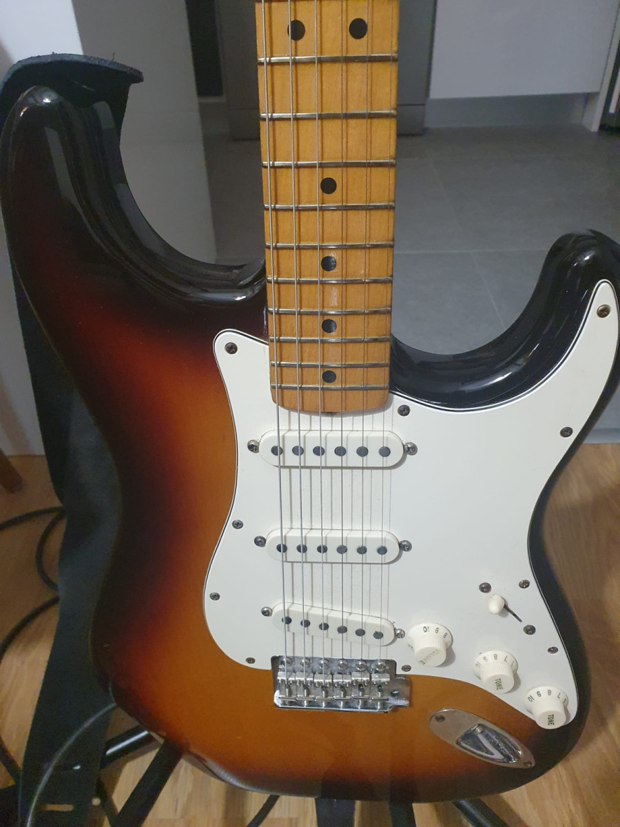 Vendo esta guitarra, todo original excepto el puente que se cambió porque en el original el bloque estaba rajado y no se podía usar la palanca de tremolo, el estuche que tengo tampoco es original ni Fender, por lo demás todo original. Estaría abierto a cambiarle por una con diapasón de palisandro.