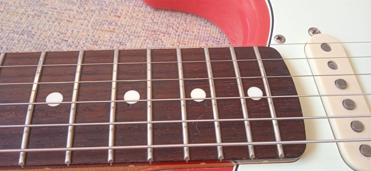 La guitarra se ha tocado mucho, quiero que quede claro, no es una guitarra de tienda. Actualmente tiene un ajuste excelente, blandita de tocar con calibre 10-46.
