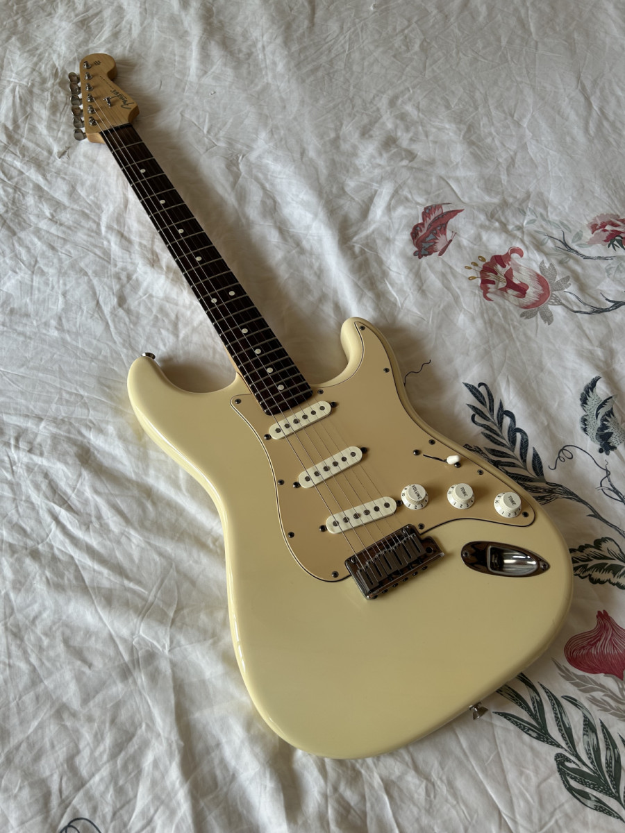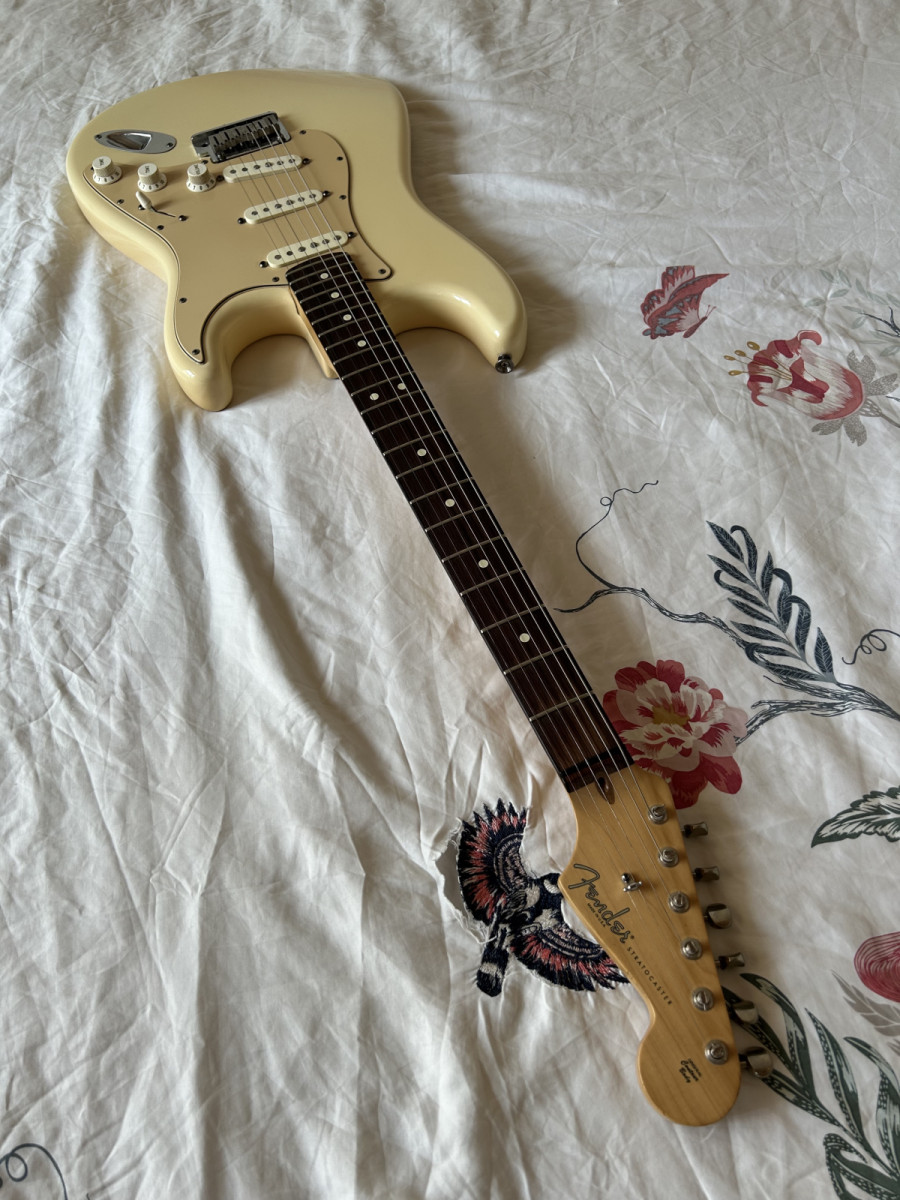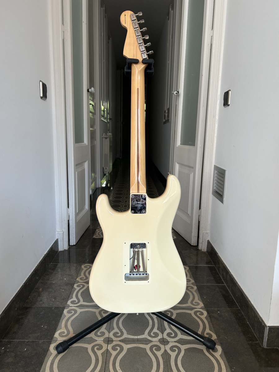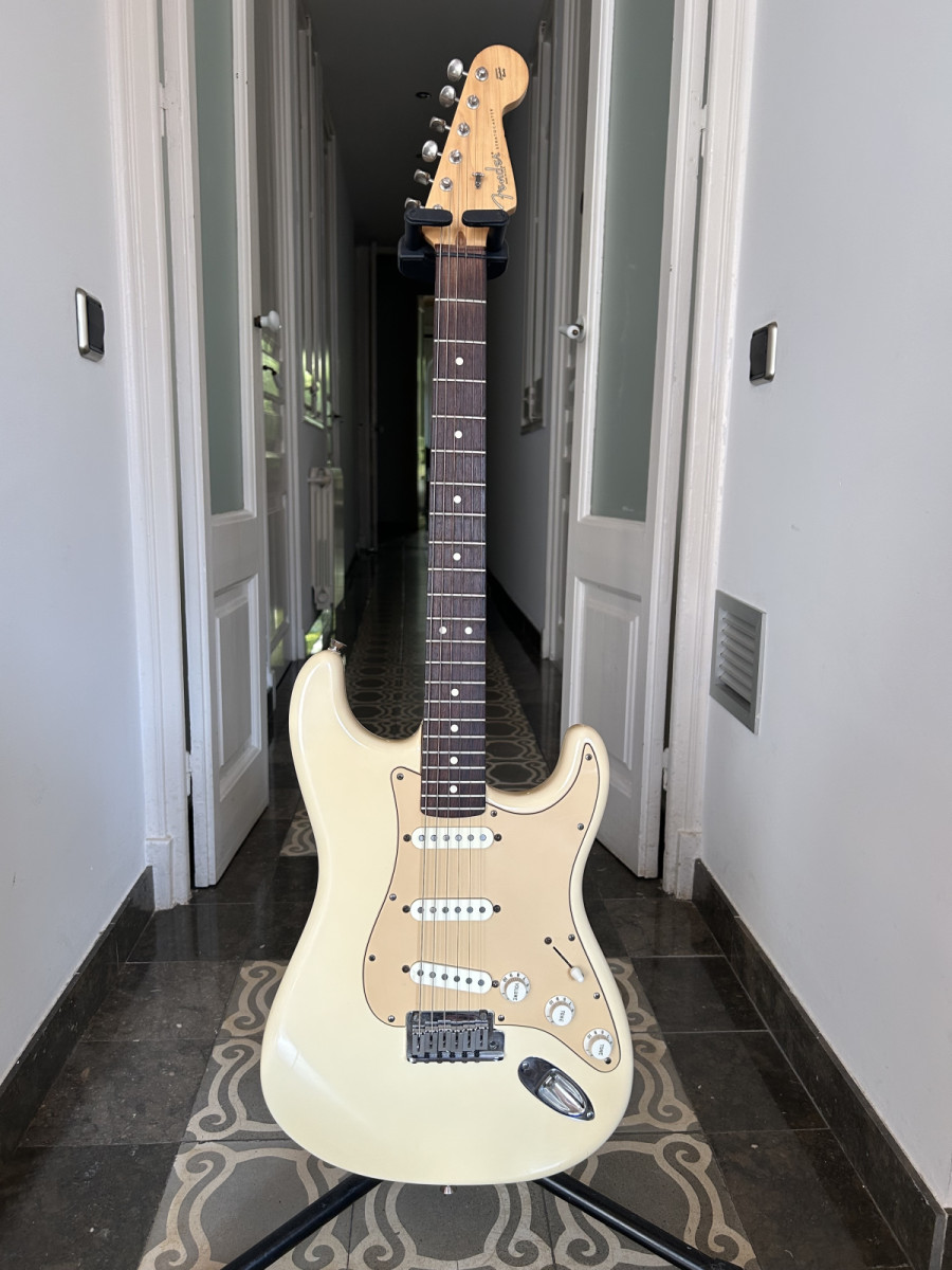 Preciosa Fender American Standard Stratocaster de 2005 en Olypic White. El color tanto del cuerpo como del golpeador se ha oscurecido con los años y le da un aspecto precioso. Tiene algunos pequeños golpes o rayadas que he sacado en alguna de las fotos. Pesa 3,6 kg. A parte, lleva algunas mejoras (de ahí el precio):