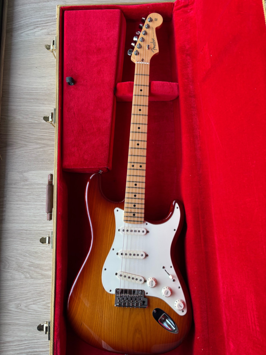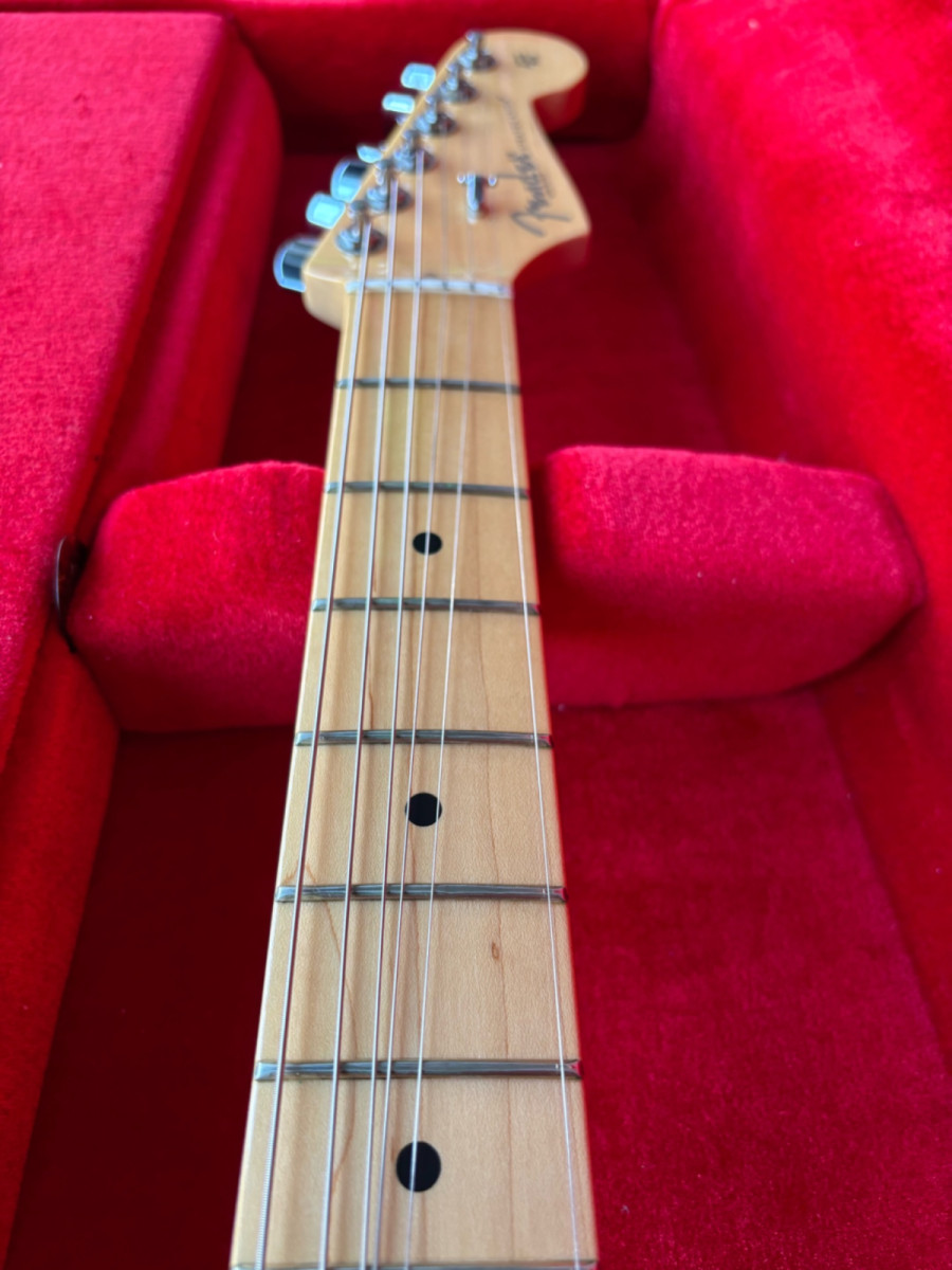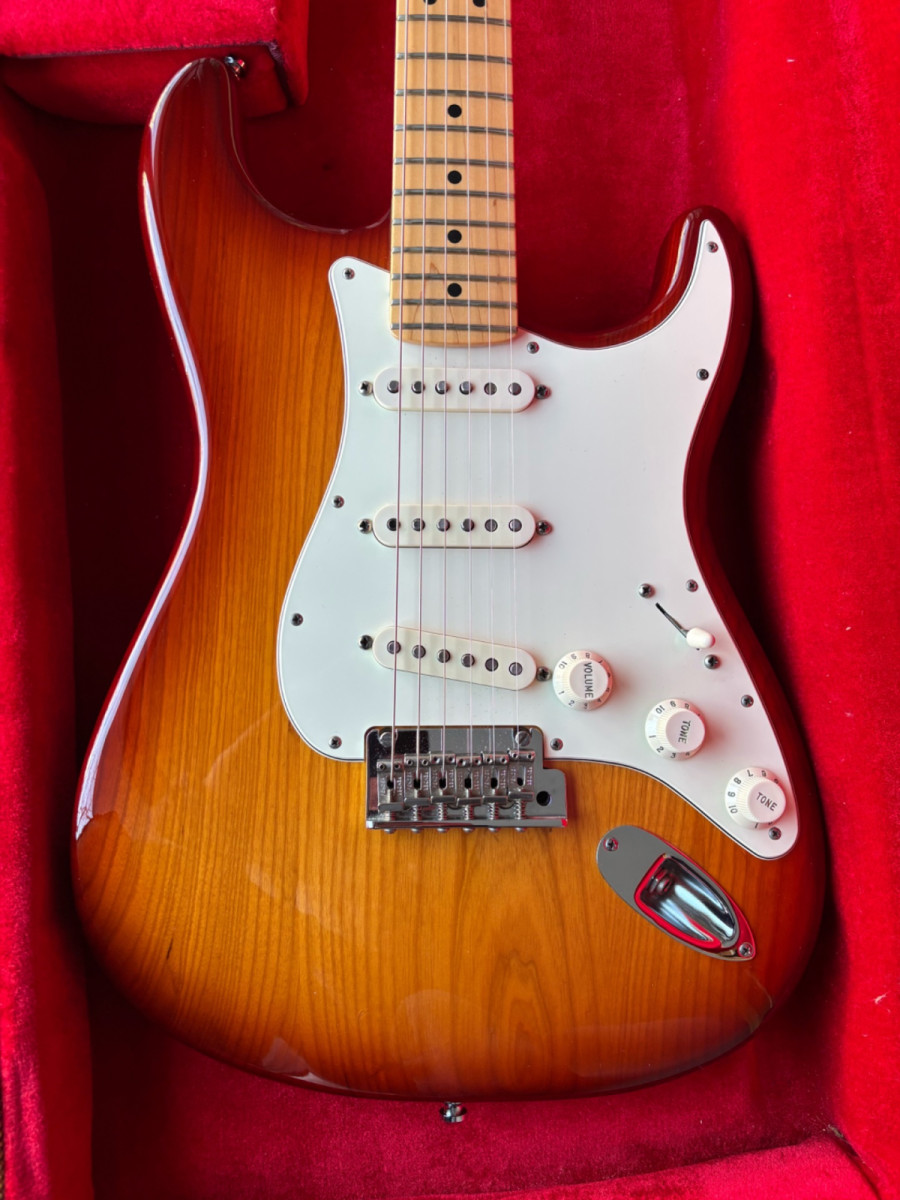 Guitarra eléctrica Fender Stratocaster American Standard Sienna Sunburst con cuerpo de fresno, mástil de arce tipo C con 22 trastes médium jumbo, radio 9,5. Pastillas Custom Shop Fat ‘50s. Cierres de seguridad Schaller, correa Fender, palanca de tremolo, documentación y funda Fender.