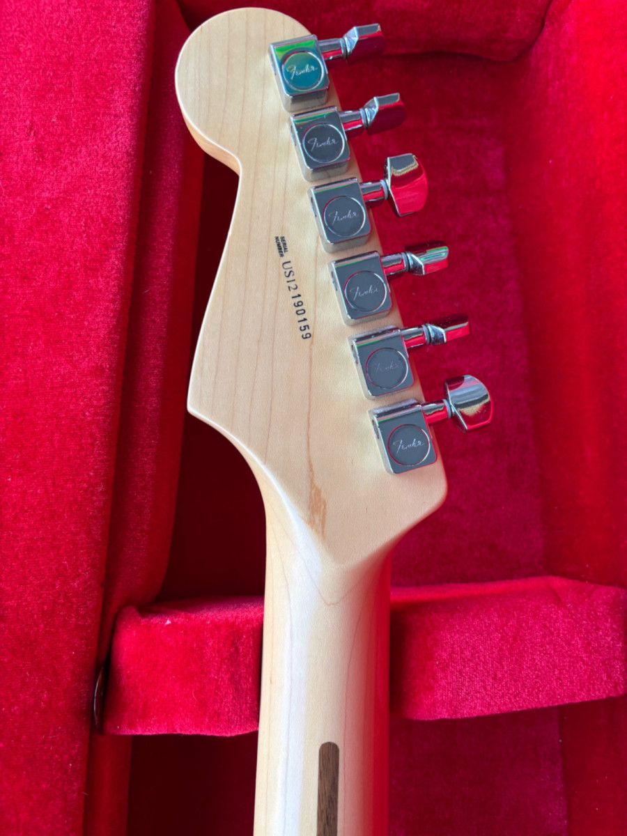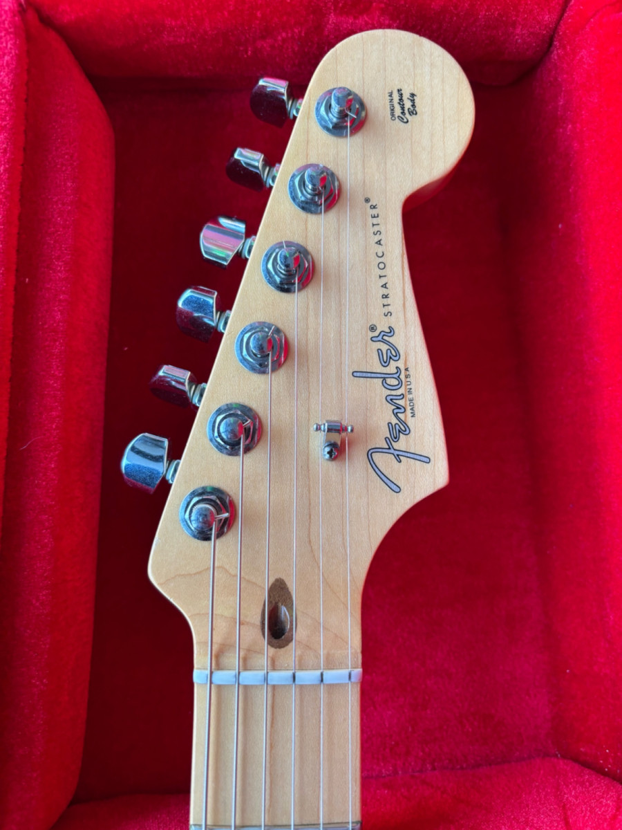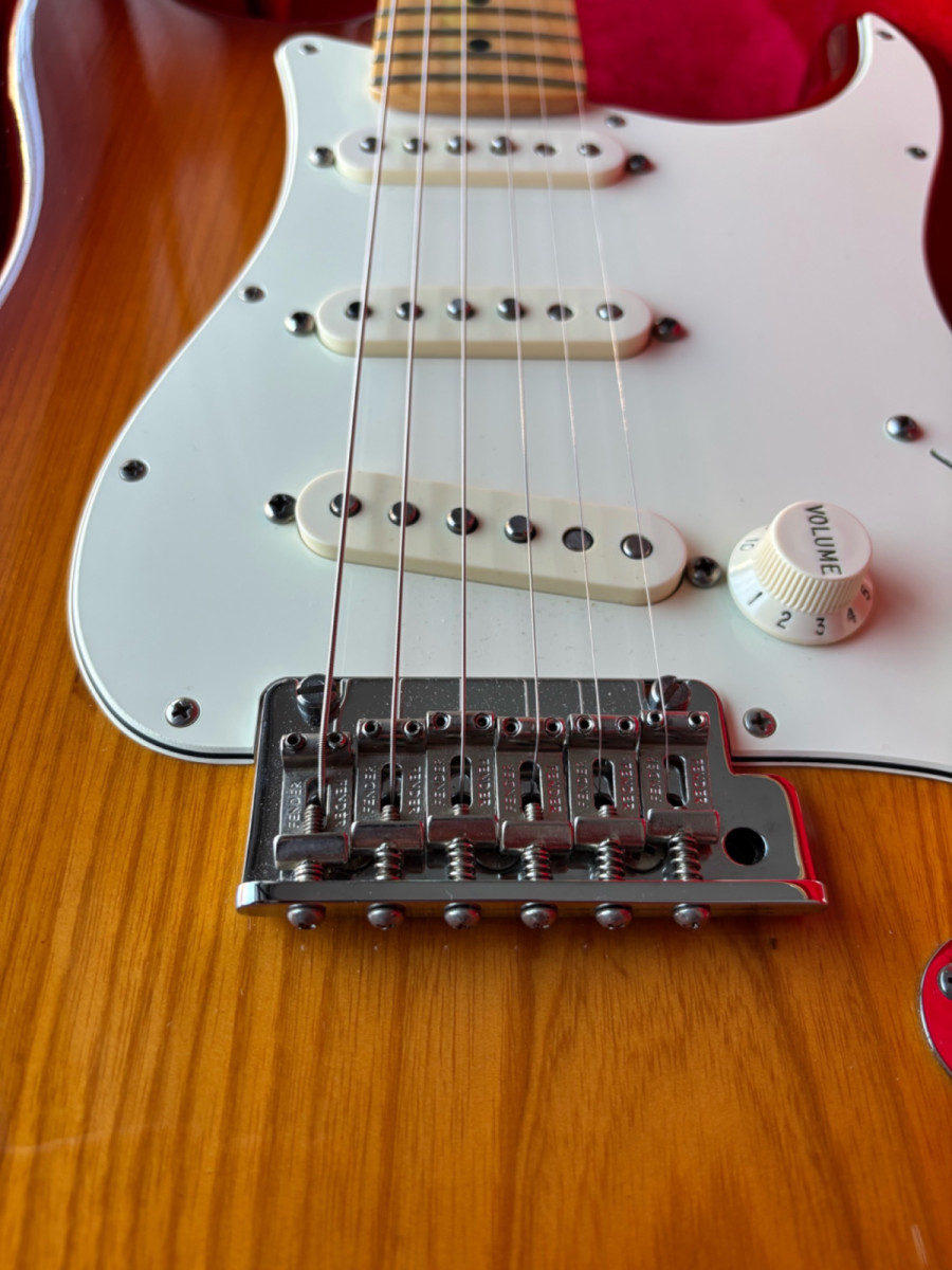 Guitarra eléctrica Fender Stratocaster American Standard Sienna Sunburst con cuerpo de fresno, mástil de arce tipo C con 22 trastes médium jumbo, radio 9,5. Pastillas Custom Shop Fat ‘50s. Cierres de seguridad Schaller, correa Fender, palanca de tremolo, documentación y funda Fender.