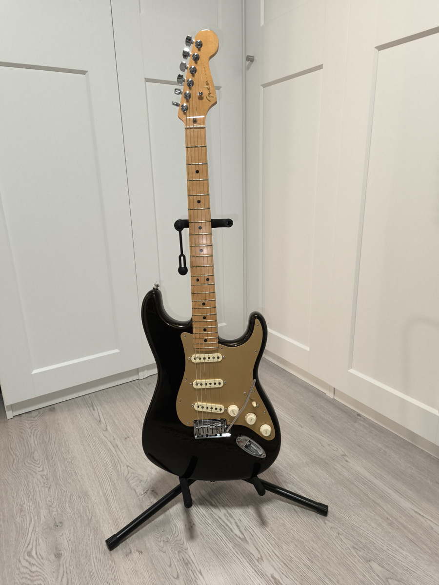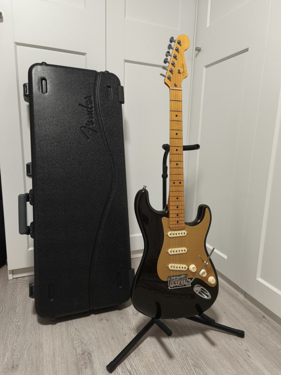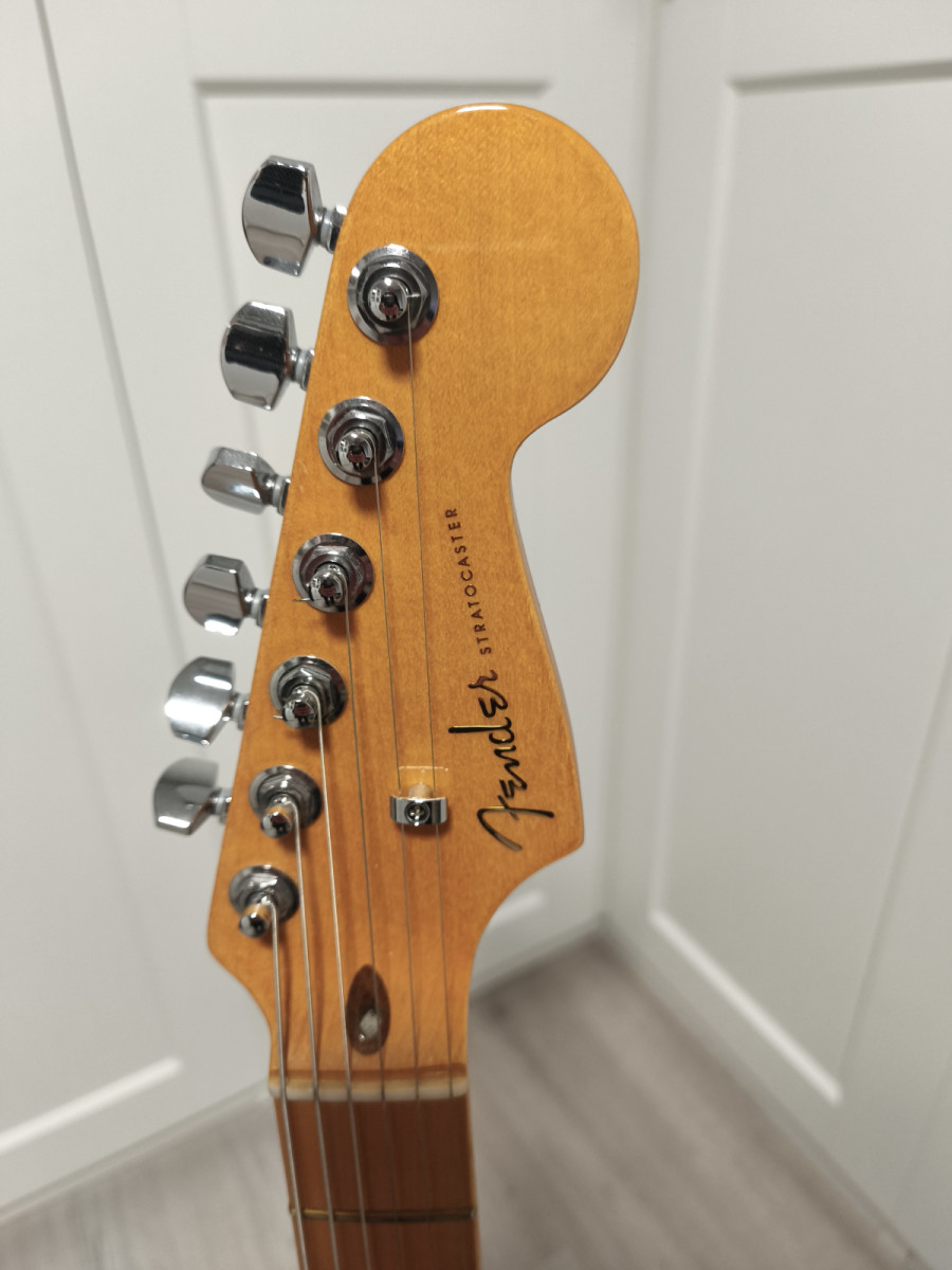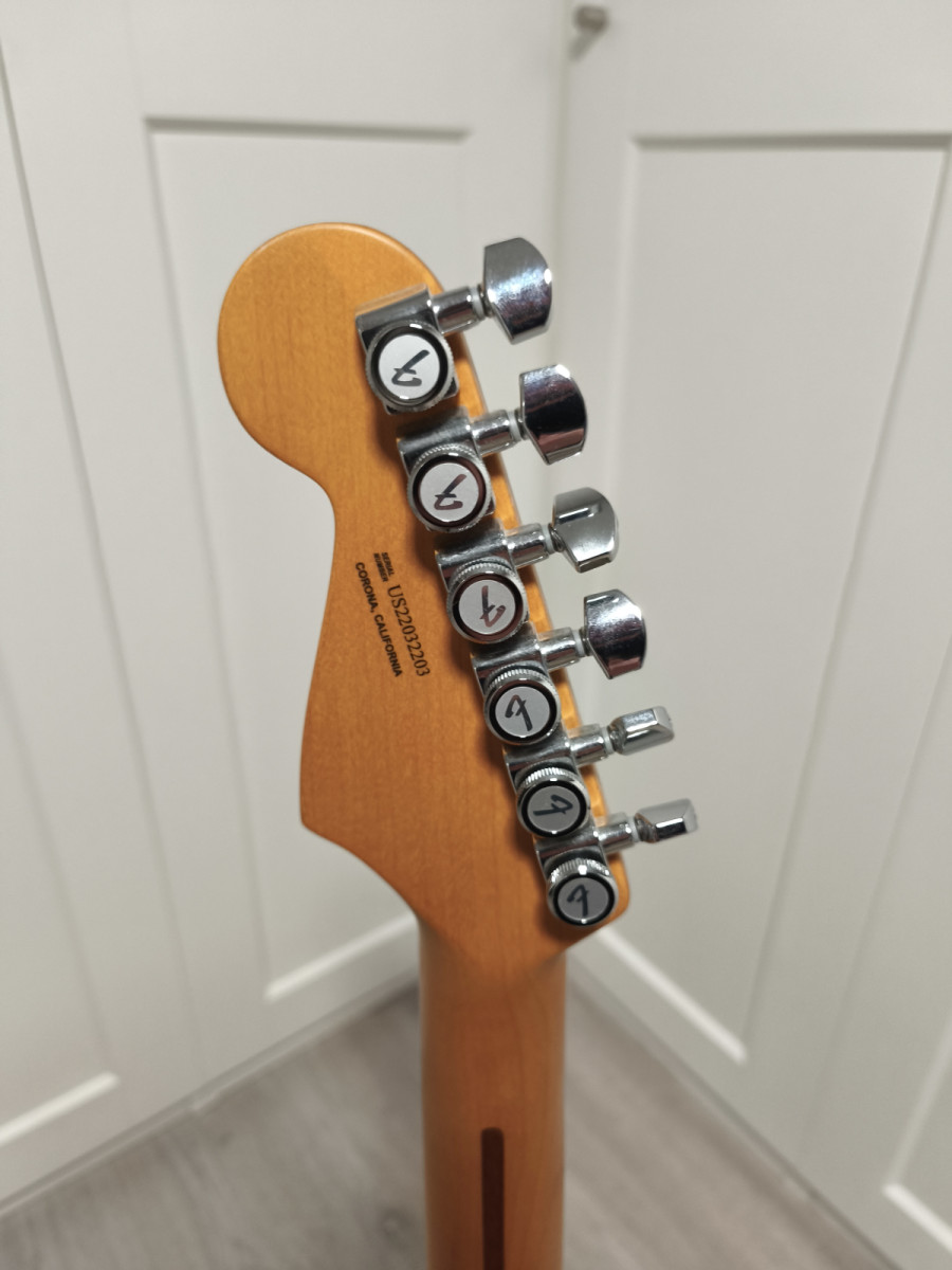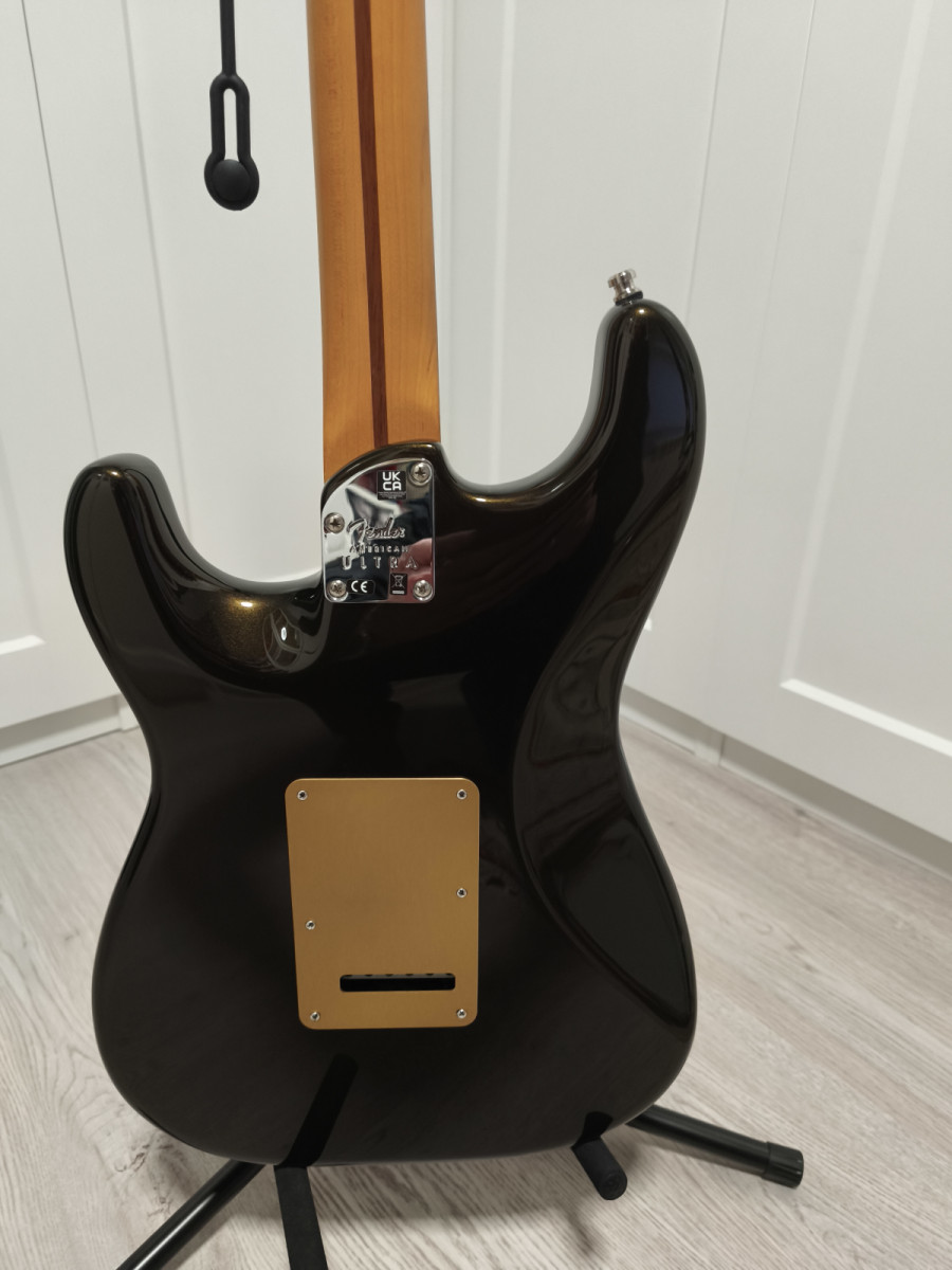 Fender Stratocaster American Ultra Texas Tea - Cuerpo de aliso. Mástil de arce. Forma del mástil compuesto "Modern D". Diapasón de arce con radio compuesto (10"-14" 254 - 355,6mm). 22 trastes medium jumbo. 3 nuevas pastillas Ultra Noiseless Vintage Strat. Master Volume (con interruptor S-1), Tone 1 (Pastillas mástil y medio), Tone 2 (Pastilla puente). Interruptor Blade de 5 posiciones. Trémolo sincronizado de 2 puntos Deluxe. Incluye estuche. Made in USA.