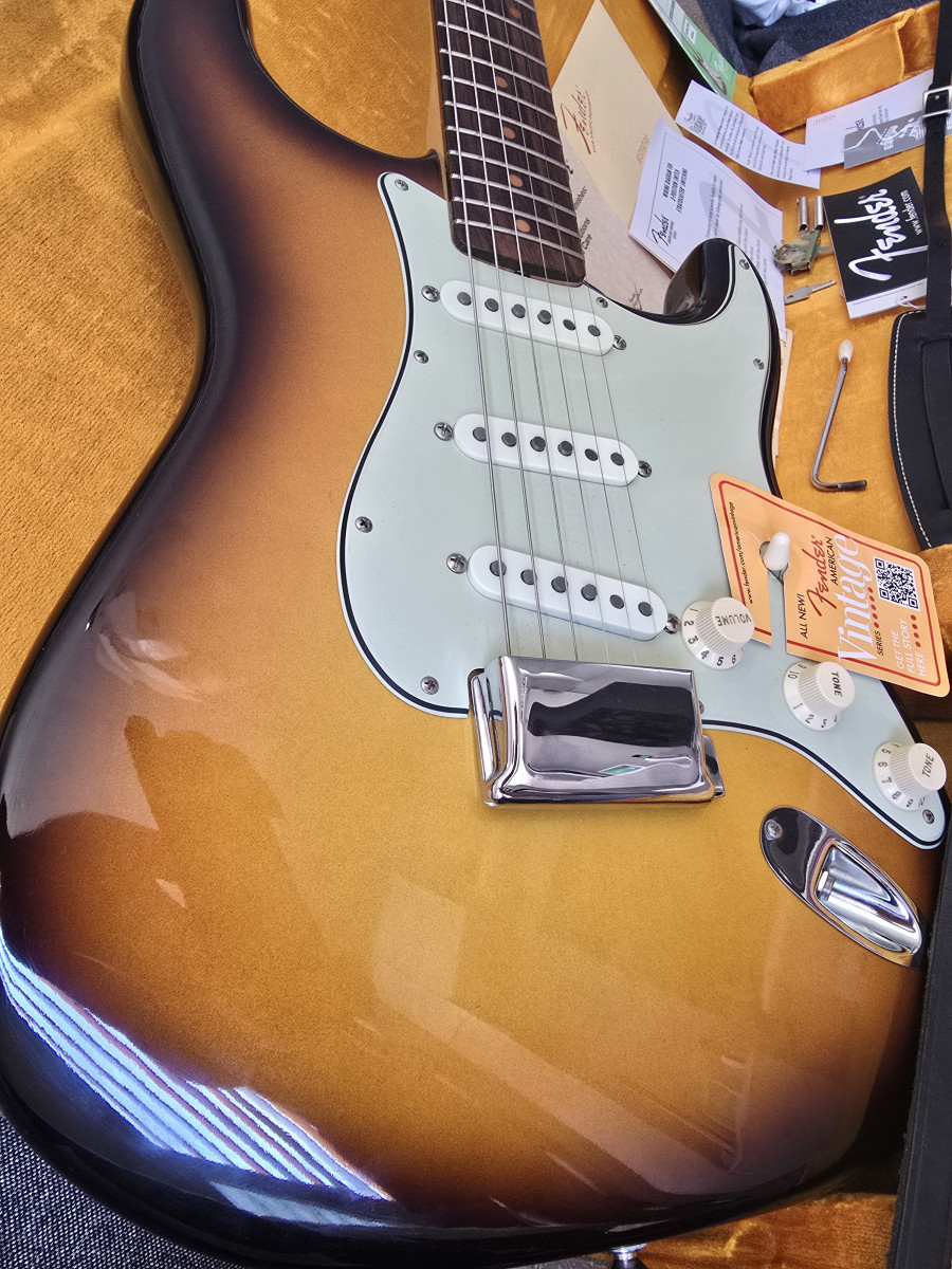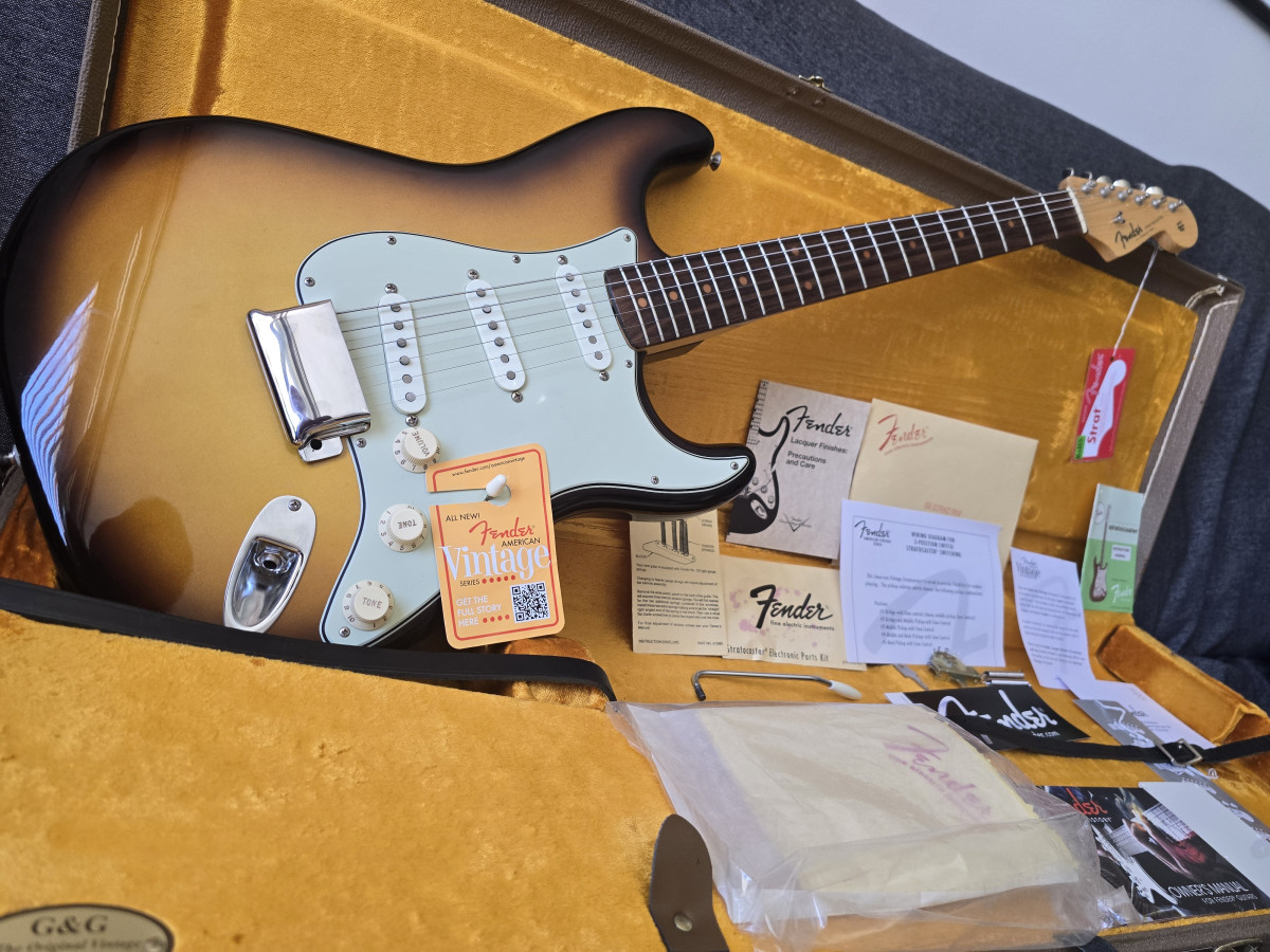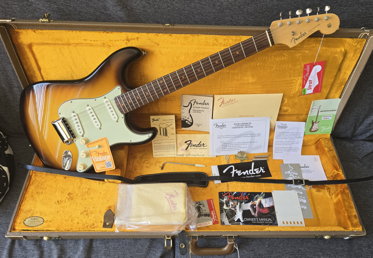 📦 Incluye absolutamente todo lo original: estuche rígido G&G con interior dorado, tags, stickers, manual, cenicero,switch 3 posiciones,diagrama de cableado, certificado, paño Fender, correa vintage y documentación completa (como se aprecia en las fotos).