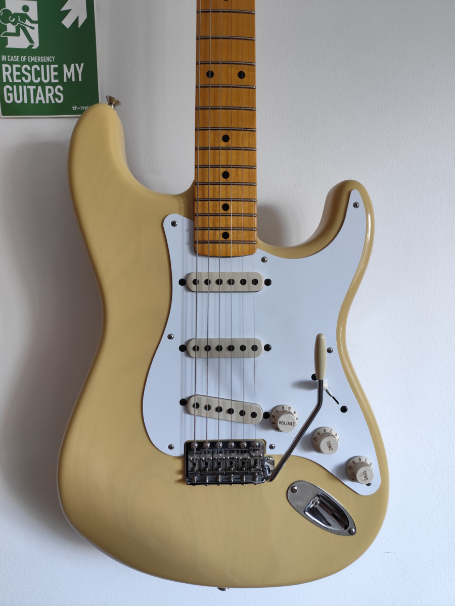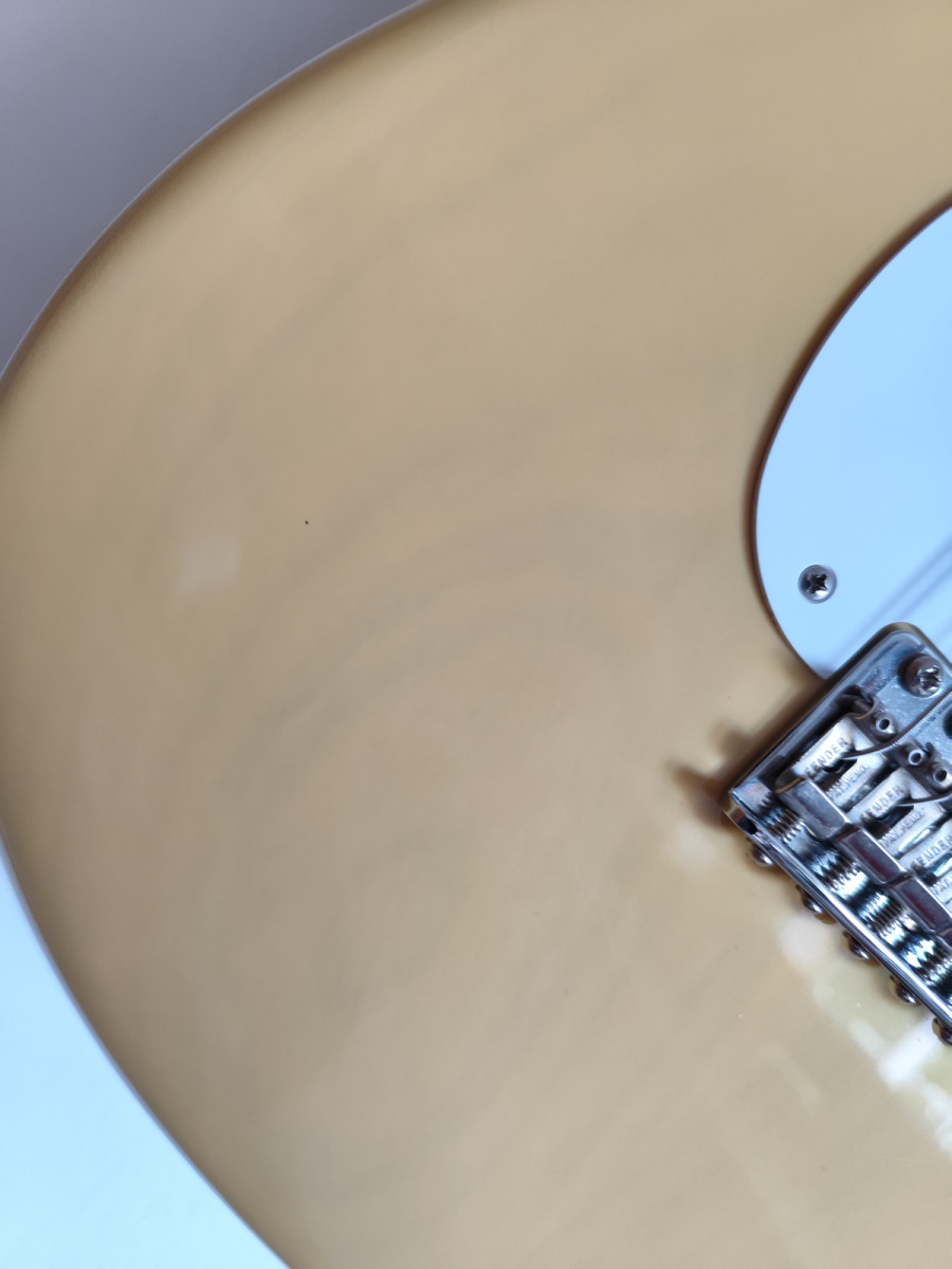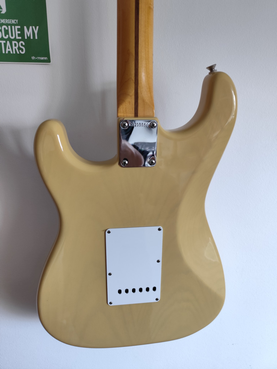 Resumiendo, todo original salvo un set Seymour Duncan Antiquity Texas Hot, montado sobre electrónica apantallada y renovada. No conservo ni las pastillas ni el golpeador originales.