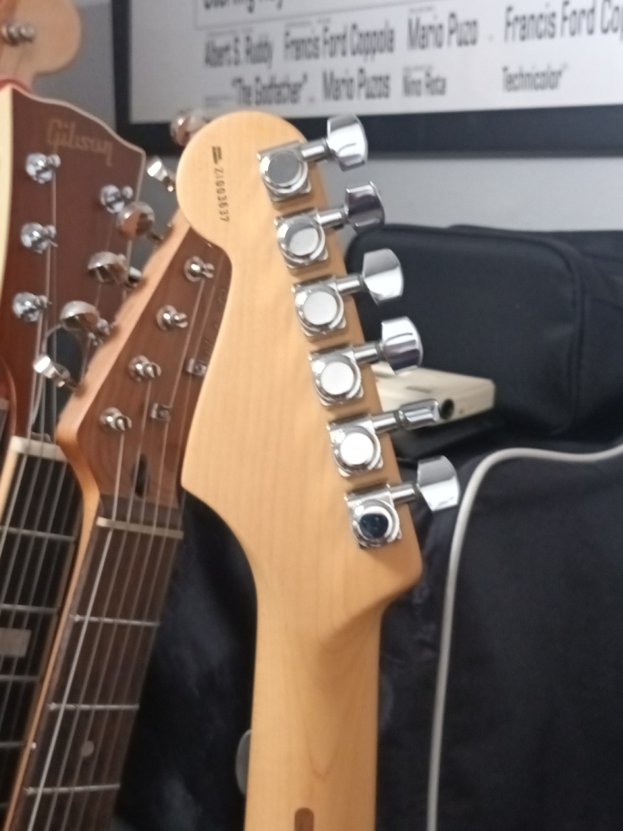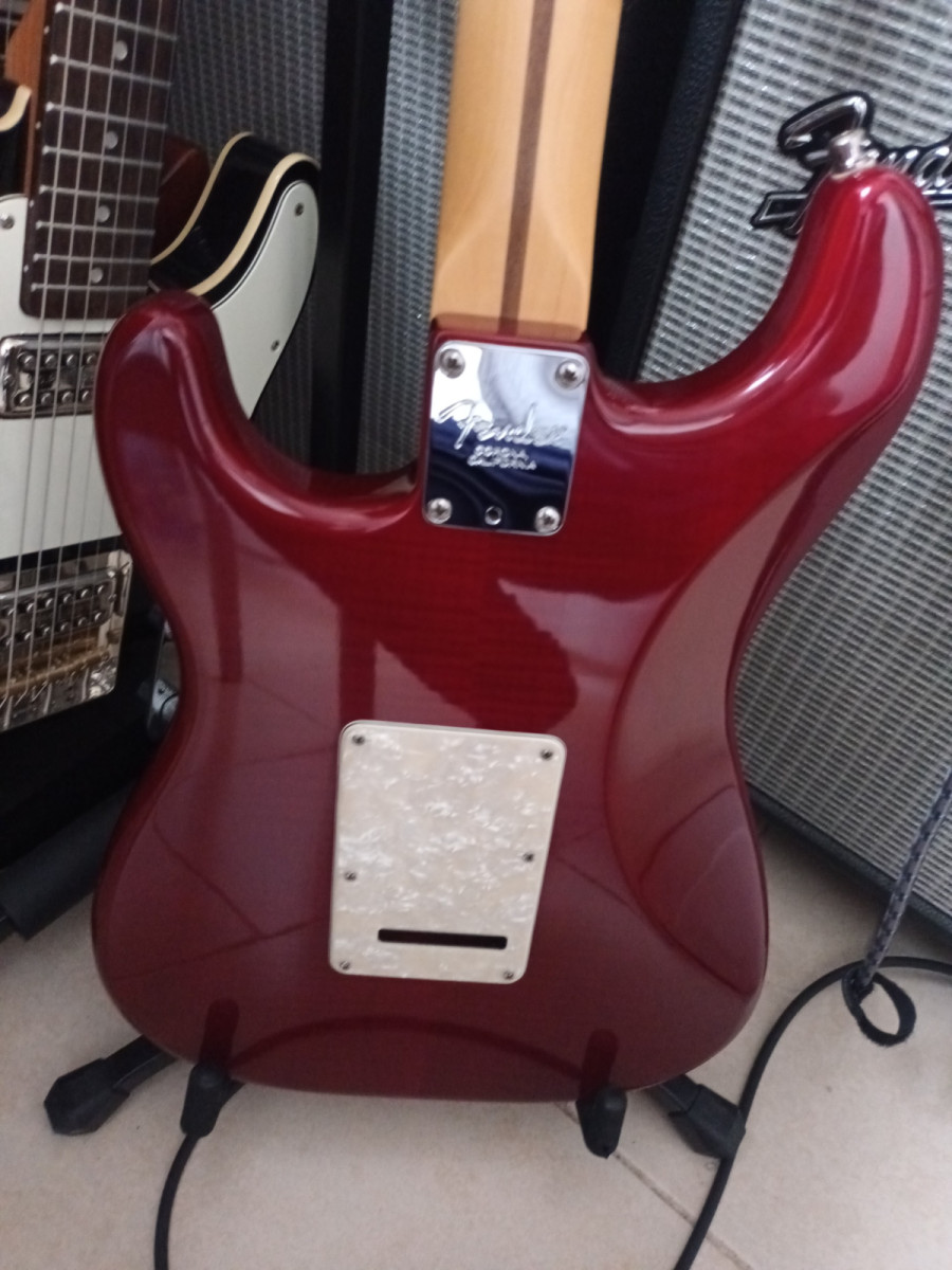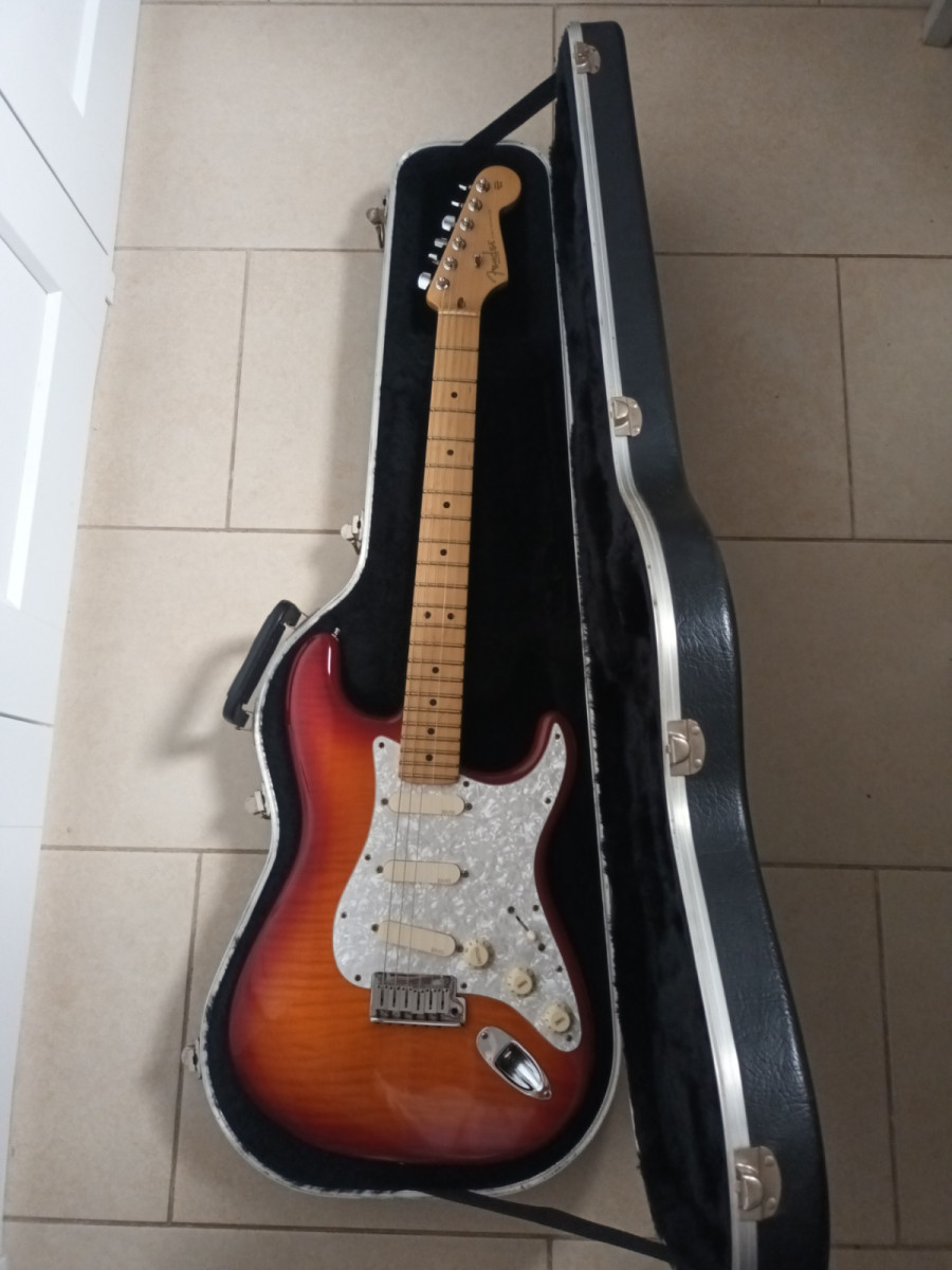 Vendo esta maravilla, una fender stratocaster USA del año 2001, con tapa de maple flamed, impecable y con su estuche original. No tiene ni un solo ding o rasguño. Monta el kit EMG dg20 del señor Gilmour lo que le hace ganar en versatilidad: Aparte de ser super silenciosa, nada del ruido de las típicas posiciones 1, 3 y 5 típicos de las single coils al uso. En los pots de tono monta, por un lado el EXG Guitar Expander, para incrementar la frecuencia de agudos y graves, y por otro el control de presencia SPC para incrementar los medios, una especie de booster que abrir, por ejemplo, al hacer un solo. Igualmente, monta clavijeros de bloqueo para dar estabilidad a la afinación al usar la barra del trémolo. Prefiero no tener que enviar por el riesgo que supone.