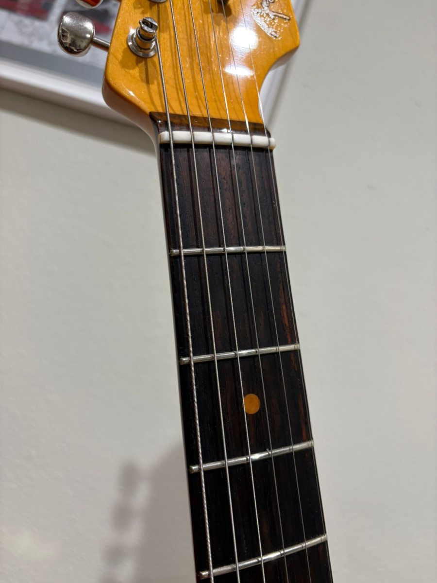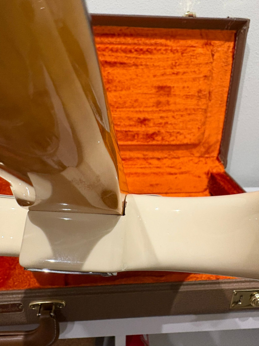 Como se puede ver en las fotos, tiene algunos toques en la pintura y en la parte de abajo un reacción de la nitro como suele pasar en algunas guitarras pintadas de esta forma.