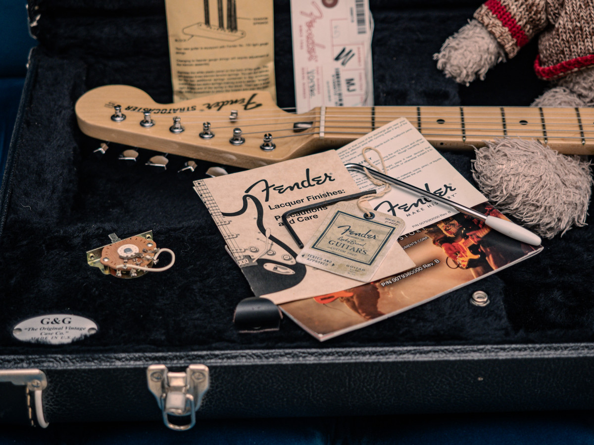 La guitarra se encuentra en muy buenas condiciones, trastes sin marcas, tan sólo dos microtoques apenas apreciables ( muestra en las fotos), tiene documentos, palanca, selector de tres posiciones de repuesto, muelles ,llave y correa de piel.